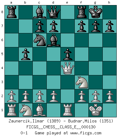 Last move : 0-1 2010 December 16 10:34:33 [Event "FICGS__CHESS__CLASS_E__000130"] [Site "FICGS"] [Date "2010.11.02"] [Round "1"] [White "Zaunercik,Ilmar"] [Black "Budnar,Milos"] [Result "0-1"] [WhiteElo "1389"] [BlackElo "1351"] 1.e4 e5 2.Nf3 Nc6 3.Bb5 a6 4.Ba4 Nf6 5.O-O Nxe4 6.Qe2 b5 7.Bxb5 axb5 8.Qxe4 Bd6 9.Re1 O-O 0-1 This chess game has been lost on time (started : 2010.11.02 10:3:8) Ruy Lopez : Open, Tartakower variation Kingside Castling by player White (move 5) Kingside Castling by player Black (move 9) Player Black won this chess game. Follow this game move after move (download)Chess, like any creative activity, can exist only through the combined efforts of those who have creative talent, and those who have the ability to organize their creative work. (Mikhail Botvinnik) Ein Buch ist ein Spiegel; wenn ein Affe hineinsieht, so kann kein Apostel heraus gucken. (Georg Christoph Lichtenberg) Después de la respuesta de las negras a 1.e4 con 1..e5, se quedan siempre tratando de entrar dentro del juego. (Howard Staunton) Karpov est une pièce de musée. (Garry Kasparov) It is the aim of the modern school, not to treat every position according to one general law, but according to the principle inherent in the position. (Richard Reti)