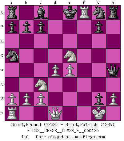 Last move : 1-0 2010 November 7 0:7:59 [Event "FICGS__CHESS__CLASS_E__000130"] [Site "FICGS"] [Date "2010.11.02"] [Round "1"] [White "Gonet,Gerard"] [Black "Bizet,Patrick"] [Result "1-0"] [WhiteElo "1232"] [BlackElo "1339"] 1.f4 e5 2.fxe5 d6 3.Nf3 h5 4.e4 Nc6 5.exd6 Bxd6 6.d4 h4 7.Bc4 Na5 8.Bxf7+ Kxf7 9.Bg5 Be7 10.Ne5+ Ke8 11.Bxe7 Qxe7 12.Nc3 h3 13.O-O hxg2 14.Rf7 Qh4 15.Rf8+ 1-0 Bird : From gambit Kingside Castling by player White (move 13) Player White won this chess game. Follow this game move after move (download)Chess is above all, a fight ! (Emanuel Lasker) Das Schach ist nichts für kleine Geister, es beansprucht einen vollen Mann, der sich nicht sklavisch an das Überlieferte hält, sondern selbständig die Tiefen des Spiels zu ergründen sucht. (Wilhelm Steinitz) Yo siempre he tenido un ligero sentimiento de lástima por una persona que no tiene conocimiento del Ajedrez. (Siegbert Tarrasch) Les Echecs ont trois composantes : le temps, l'espace et le matériel en dernier. (Mikhail Tal) Go and wake up your luck. (Persian saying)