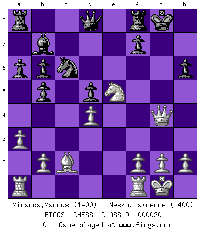 Last move : 1-0 2006 December 2 17:41:30 [Event "FICGS__CHESS__CLASS_D__000020"] [Site "FICGS"] [Date "2006.11.28"] [Round "1"] [White "Miranda,Marcus"] [Black "Nesko,Lawrence"] [Result "1-0"] [WhiteElo "1400"] [BlackElo "1400"] 1.e4 e5 2.Nf3 Nc6 3.Bb5 a6 4.Ba4 Nf6 5.O-O Bc5 6.c3 b5 7.Bc2 O-O 8.d4 exd4 9.cxd4 Bb6 10.Bg5 d6 11.Nc3 h6 12.Bh4 Nb4 13.Bb3 Bb7 14.a3 Nc6 15.Nd5 Na5 16.Bxf6 gxf6 17.Nxb6 cxb6 18.Bc2 d5 19.e5 fxe5 20.Nxe5 Nc6 21.Qg4+ 1-0 Ruy Lopez : Moeller defense Kingside Castling by player White (move 5) Kingside Castling by player Black (move 7) Player White won this chess game. Follow this game move after move (download)Spassky will not be psyched out by Fischer. (Mike Goodall) Computer sind die einzigen Gegner, die nicht immer eine Ausrede auf Lager haben, wenn sie gegen mich verlieren. (Robert James Fischer) Yo no le temo a Spassky. Todos saben que yo soy el mejor. Uno no necesita un torneo para probarlo. (Bobby Fischer) Les échecs, c'est l'art d'analyser. (Mikhail Botvinnik) Memory is a crazy woman that hoards colored rags and throws away food. (Austin O'Malley)