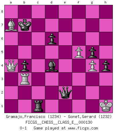Last move : 0-1 2010 November 26 10:17:45 [Event "FICGS__CHESS__CLASS_E__000130"] [Site "FICGS"] [Date "2010.11.02"] [Round "1"] [White "Gramajo,Francisco"] [Black "Gonet,Gerard"] [Result "0-1"] [WhiteElo "1234"] [BlackElo "1232"] 1.Nf3 Nc6 2.e4 Nf6 3.d3 e5 4.Bg5 Be7 5.h3 h6 6.Bh4 g5 7.Bg3 d6 8.Nc3 Be6 9.d4 exd4 10.Nxd4 Nxd4 11.Qxd4 c5 12.Qa4+ Bd7 13.Qb3 Bc6 14.Bc4 Rf8 15.Rd1 Nxe4 16.Nxe4 Bxe4 17.O-O Qd7 18.f3 Bg6 19.Rd2 O-O-O 20.a4 h5 21.a5 h4 22.Bf2 Qc7 23.c3 Qxa5 24.Qd1 b5 25.Bb3 c4 26.Bc2 Bxc2 27.Rxc2 f5 28.Re1 Bf6 29.R1e2 Rde8 30.b4 cxb3 31.Rxe8+ Rxe8 32.Rb2 Bxc3 33.Rxb3 Rd8 34.Qc2 b4 35.g4 Kb8 36.f4 fxg4 37.hxg4 Rc8 38.f5 Rc4 39.Qe2 Qd5 40.Qe8+ Rc8 41.Bxa7+ Kb7 42.Qa4 Qd1+ 43.Kg2 Qe2+ 44.Kg1 Bd4+ 45.Kh1 Rc1+ 0-1 Reti Opening Kingside Castling by player White (move 17) Queenside Castling by player Black (move 19) Player Black won this chess game. Follow this game move after move (download)There are two types of sacrifices: correct ones and mine. (Mikhail Tal) Im Schach nämlich geht es darum, daß Ich des Gegners klein zu kriegen, sein Ego zu zerbrechen und zu zermahlen, seine Selbstachtung zu zertreten und zu verscharren und seine ganze mißachtenswerte sogenannte Persönlichkeit ein für alle Mal tot zu hacken und zu zerstampfen und dadurch die menschliche Gesellschaft von einer stinkenden Pestbeule zu befreien. Es ist ein königliches Spiel. (Robert James Fischer) El Ajedrez es tan interesante por sí solo, que no es necesario un interés monetario para persuadir a una persona a que lo practique; por lo tanto, nunca se juega por dinero. (Benjamin Franklin) On croit qu'il y a plus de mauvais joueurs que de bons joueurs, c'est faux : Il y a autant de joueurs qui gagnent que de joueurs qui perdent. (Philippe Geluck) I live to kill Traxler counterattack. (Ilmars Cirulis)