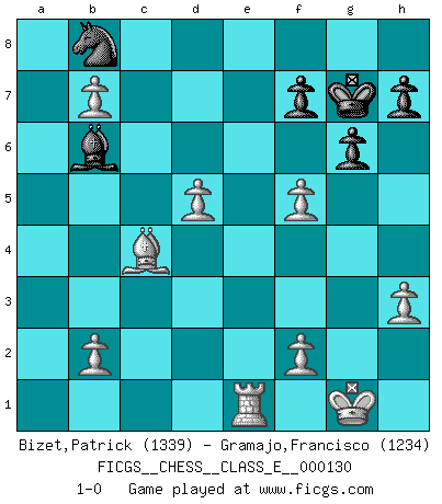 Last move : 1-0 2011 January 30 23:37:32 [Event "FICGS__CHESS__CLASS_E__000130"] [Site "FICGS"] [Date "2010.11.02"] [Round "1"] [White "Bizet,Patrick"] [Black "Gramajo,Francisco"] [Result "1-0"] [WhiteElo "1339"] [BlackElo "1234"] 1.e4 g6 2.d4 Bg7 3.c4 c6 4.Nc3 d5 5.cxd5 cxd5 6.exd5 Nf6 7.Bc4 a6 8.a4 O-O 9.Qb3 Nbd7 10.a5 e5 11.Be3 exd4 12.Bxd4 b5 13.axb6 Qe7+ 14.Nge2 Nc5 15.Bxc5 Qxc5 16.Na4 Qe7 17.O-O Bg4 18.Nd4 Rfb8 19.Nc6 Qd6 20.Nxb8 Qxb8 21.Nc5 a5 22.b7 Ra7 23.Qb6 Bf8 24.Rxa5 Bxc5 25.Rxa7 Bxb6 26.Ra8 Nd7 27.Re1 Kf8 28.h3 Bf5 29.g4 Kg7 30.Rxb8 Nxb8 31.gxf5 1-0 Robatsch (Modern) defense Kingside Castling by player Black (move 8) Kingside Castling by player White (move 17) Player White won this chess game. Follow this game move after move (download)In Chess, as it is played by masters, chance is practically eliminated. (Emanuel Lasker) Ich moechte nie einem Club beitreten, der Leute wie mich als Mitglieder aufnimmt. (Woody Allen) Una clavada es mas poderosa que una espada. (Fred Reinfeld) Comme les marins qui ont mille raisons différentes d'aller en mer, les joueurs d'échecs en ont tout autant avant de s'installer devant une table et jouer... (Vincent Bertignac, philosophe) The only thing that matters is the evidence. (Horatio Caine, C.S.I. Miami)