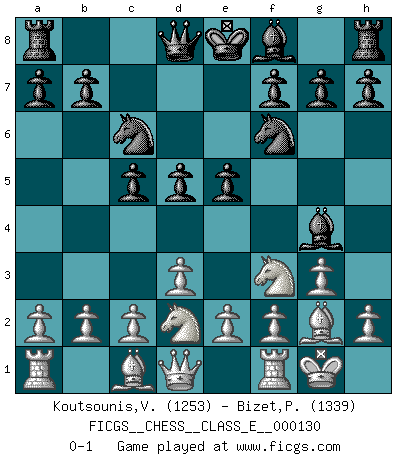 Last move : 0-1 2010 December 18 10:38:22 [Event "FICGS__CHESS__CLASS_E__000130"] [Site "FICGS"] [Date "2010.11.02"] [Round "1"] [White "Koutsounis,Vassilios"] [Black "Bizet,Patrick"] [Result "0-1"] [WhiteElo "1253"] [BlackElo "1339"] 1.Nf3 d5 2.g3 Nf6 3.Bg2 c5 4.d3 Nc6 5.O-O Bg4 6.Nbd2 e5 0-1 This chess game has been lost on time (started : 2010.11.02 10:3:8) Reti : King's Indian attack (Barcza system) Kingside Castling by player White (move 5) Player Black won this chess game. Follow this game move after move (download)Chess opens and enriches your mind. (Saudin Robovic) Ich weiss nicht was Gott gegen mich auf 1.e4 antworten würde. (Robert James Fischer) Solo existe una cosa que Fischer hace en el Ajedrez sin placer: ¡perder!. (Boris Spassky) Horreur, mais aussi harmonie suprême : qu'y avait-il en effet au monde en dehors des échecs ? Le brouillard, l'inconnu, le non-être... (Vladimir Nabokov) Once you start thinking you have nothing left to learn, you have everything to learn. (Steve Badget)
