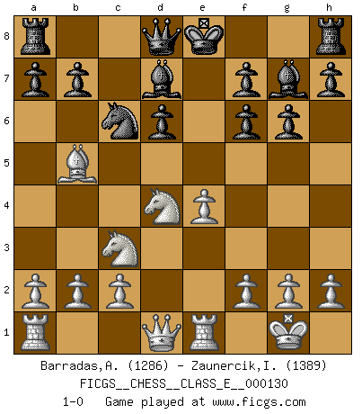 Last move : 1-0 2010 December 18 10:38:22 [Event "FICGS__CHESS__CLASS_E__000130"] [Site "FICGS"] [Date "2010.11.02"] [Round "1"] [White "Barradas,Anderson"] [Black "Zaunercik,Ilmar"] [Result "1-0"] [WhiteElo "1286"] [BlackElo "1389"] 1.e4 c5 2.Nf3 Nc6 3.d4 cxd4 4.Nxd4 d6 5.Nc3 Nf6 6.Bg5 g6 7.Bb5 Bd7 8.Bxf6 exf6 9.O-O Bg7 10.Re1 1-0 This chess game has been lost on time (started : 2010.11.02 10:3:8) Sicilian defense Kingside Castling by player White (move 9) Player White won this chess game. Follow this game move after move (download)The passed pawn is a criminal, who should be kept under lock and key. Mild measures, such as police surveillance, are not sufficient. (Nimzovitch) Ich habe kein Problem mit Frauen, sondern nur mit dem Niveau ihres Schachspiels (Judith Polgar) El juego de Fischer siempre fue nítido, racional y brillante. Uno de los mejores por siempre. (Dave Regis) Shah mat. Le roi est mort. Cri de fierté d'un joueur venant de terrasser son adversaire, courtoisement, sans effusion de sang. I find television to be very educating. Every time somebody turns on the set, I go in the other room and read a book. (Groucho Marx)