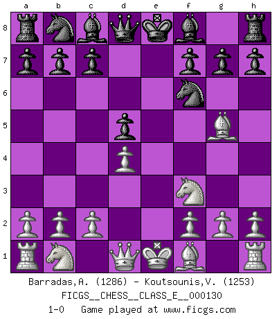Last move : 1-0 2010 December 17 10:37:0 [Event "FICGS__CHESS__CLASS_E__000130"] [Site "FICGS"] [Date "2010.11.02"] [Round "1"] [White "Barradas,Anderson"] [Black "Koutsounis,Vassilios"] [Result "1-0"] [WhiteElo "1286"] [BlackElo "1253"] 1.e4 e6 2.d4 d5 3.exd5 exd5 4.Nf3 Nf6 5.Bg5 1-0 This chess game has been lost on time (started : 2010.11.02 10:3:8) French : Exchange variation Player White won this chess game. Follow this game move after move (download)A passed Pawn increases in strength as the number of pieces on the board diminishes. (Capablanca) Ich bin stolz ein Bulgare zu sein. (Veselin Topalov) Vive, pierde y aprende al observar a tu oponente como gana. (Amber Steenbock) On est toujours la mazette de quelqu'un d'autre. (Anonyme) There are two kinds of tragedy in this world, one is not getting what you want and the other is getting. (Lord of war)