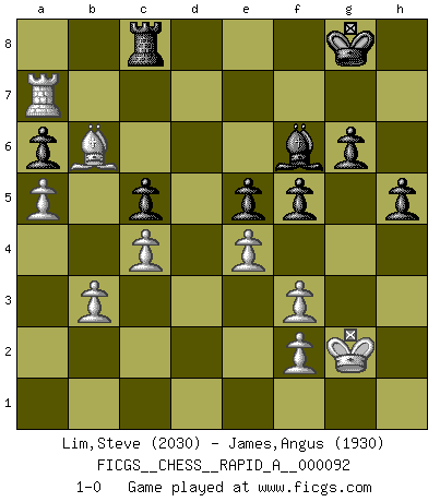 Last move : 1-0 2011 February 18 15:1:56 [Event "FICGS__CHESS__RAPID_A__000092"] [Site "FICGS"] [Date "2010.11.02"] [Round "1"] [White "Lim,Steve"] [Black "James,Angus"] [Result "1-0"] [WhiteElo "2030"] [BlackElo "1930"] 1.d4 Nf6 2.c4 g6 3.Nc3 Bg7 4.e4 d6 5.Be2 O-O 6.Nf3 e5 7.dxe5 dxe5 8.O-O Nc6 9.Bg5 Qxd1 10.Raxd1 Bg4 11.Rd2 Bxf3 12.Bxf3 Nd4 13.Rfd1 h6 14.Be3 Nxf3+ 15.gxf3 c6 16.Na4 Rfe8 17.Nc5 b6 18.Nd7 Nxd7 19.Rxd7 c5 20.Kg2 Kf8 21.Rc7 Re7 22.R1d7 Rxd7 23.Rxd7 h5 24.Bg5 f6 25.Be3 Kg8 26.h4 f5 27.Bg5 Kf8 28.b3 Bh8 29.Rb7 Kg8 30.Be7 Bg7 31.a4 Bh8 32.Bd6 Bf6 33.Bb8 a6 34.Bc7 Bxh4 35.Bxb6 Rc8 36.a5 Bf6 37.Ra7 1-0 King's Indian : 5.Be2 Kingside Castling by player Black (move 5) Kingside Castling by player White (move 8) Player White won this chess game. Follow this game move after move (download)An attack on the wing should be met by play in the center. (Nimzovitch) Der Schachmeister von Heute braucht Courage, einen Killerinstinkt, Ausdauer und Arroganz. (Larry Evans) Repentinamente, me resultaba obvio en mi analisis que yo había pasado por alto lo que Fischer había visto en el tablero con la mas grande facilidad. (Mikhail Botvinnik) Les Echecs sont affaire de jugement sensible. Savoir quand frapper et quand esquiver. (Fischer) God is an atheist. (Unknown)