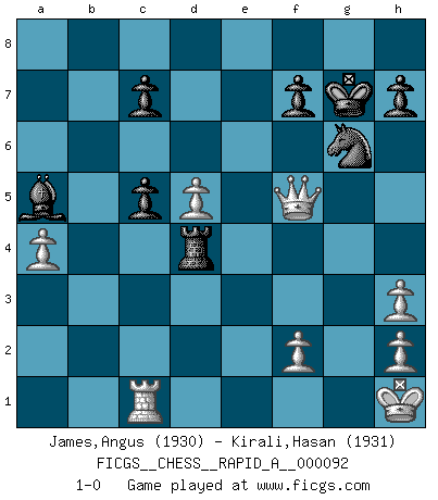 Last move : 1-0 2011 January 22 14:45:45 [Event "FICGS__CHESS__RAPID_A__000092"] [Site "FICGS"] [Date "2010.11.02"] [Round "1"] [White "James,Angus"] [Black "Kirali,Hasan"] [Result "1-0"] [WhiteElo "1930"] [BlackElo "1931"] 1.e4 e5 2.Nf3 Nc6 3.Bb5 Nf6 4.d3 Bc5 5.c3 O-O 6.O-O d6 7.Nbd2 a6 8.Ba4 b5 9.Bc2 a5 10.a4 b4 11.Nc4 Rb8 12.d4 Ba6 13.b3 Ba7 14.d5 Ne7 15.cxb4 Bxc4 16.bxc4 axb4 17.Rb1 Bc5 18.Nh4 Nc8 19.Rb3 Nxe4 20.Rh3 Nf6 21.Nf5 b3 22.Bxb3 Ne7 23.Bc2 Ng6 24.Bg5 Rb4 25.Qf3 e4 26.Bxe4 Ne5 27.Qf4 Ng6 28.Qc1 Re8 29.Nxg7 Rxe4 30.Nh5 Nxh5 31.Bxd8 Nhf4 32.Qd1 Nxh3+ 33.gxh3 Bb6 34.c5 dxc5 35.Qf3 Rf4 36.Qh5 Rbd4 37.Bg5 Rf5 38.Re1 Rxg5+ 39.Qxg5 Kg7 40.Ra1 Ba5 41.Qf5 Bc3 42.Rc1 Ba5 43.Kh1 1-0 Ruy Lopez : Berlin defense Kingside Castling by player Black (move 5) Kingside Castling by player White (move 6) Player White won this chess game. Follow this game move after move (download)Chess demands total concentration. (Bobby Fischer) Im Schach gewinnt jeder. Hat man Freunde am Spiel - und das ist die Hauptsache - ist auch der Verlust einer Partie kein Unglück. (David Bronstein) El jugador de combinación piensa hacia adelante; comienza de la posición dada y trabaja las movidas contundentes en su mente. (Emanuel Lasker) Toutes les manuvres exécutées sur une colonne ouverte ont pour but ultime l'intrusion définitive sur la septième ou la huitième rangée, en plein cur de la position ennemie. (Aaron Nimzovitch) Life is like internet, nothing interesting, but noone want to leave it. (Ilmars Cirulis)