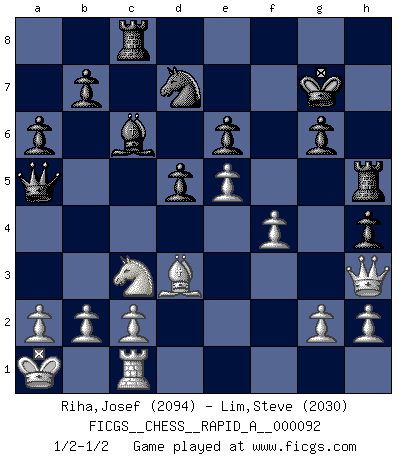 Last move : 1/2-1/2 2010 November 11 18:17:28 [Event "FICGS__CHESS__RAPID_A__000092"] [Site "FICGS"] [Date "2010.11.02"] [Round "1"] [White "Riha,Josef"] [Black "Lim,Steve"] [Result "1/2-1/2"] [WhiteElo "2094"] [BlackElo "2030"] 1.e4 e6 2.d4 d5 3.Nc3 Nf6 4.Bg5 Be7 5.e5 Nfd7 6.Bxe7 Kxe7 7.Nf3 c5 8.dxc5 Kf8 9.Qd2 Nxc5 10.O-O-O Nc6 11.Qe3 Qb6 12.Nd4 Bd7 13.Kb1 h5 14.Be2 Nxd4 15.Rxd4 Rc8 16.Rhd1 Qc7 17.Ka1 g6 18.Rh4 Kg7 19.Rh3 a6 20.Rg3 Ba4 21.Rc1 Qe7 22.Qf4 h4 23.Rg4 Bc6 24.Qe3 Nd7 25.Bd3 Rh5 26.f4 Qb4 27.Qh3 Qa5 28.Rxg6 fxg6 1/2-1/2 French : Classical Queenside Castling by player White (move 10) This chess game ended in a draw. Follow this game move after move (download)When you absolutely don't know what to do anymore, it is time to panic. (John van der Wiel) Der Freibauer hat für mich eine Seele, genau wie der Mensch, Wünsche, die unerkannt in ihm schlummern, und Befürchtungen, von deren Existenz er selbst kaum ahnt. (Aaron Nimzowitsch) Hay dos clases de hombres: aquellos que se conforman en dejarse llevar por las circunstancias y que juegan barajas y aquellos decididos a controlar las circunstancias y que juegan al Ajedrez. (Mortimer Collins) Il (Jacob Murray) ne joue pas pour le bon coup, mais pour le meilleur. (Eloi Relange) What doesn't kill us makes us stronger. (Friedrich Nietzsche)