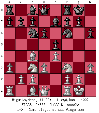 Last move : 1-0 2007 January 8 5:1:48 [Event "FICGS__CHESS__CLASS_D__000020"] [Site "FICGS"] [Date "2006.11.28"] [Round "1"] [White "Higuita,Henry"] [Black "Lloyd,Dan"] [Result "1-0"] [WhiteElo "1400"] [BlackElo "1400"] 1.e4 e5 2.Nf3 d6 3.h3 Nf6 4.Nc3 Nc6 5.Bc4 h6 6.a3 Be7 7.d3 O-O 8.O-O 1-0 This chess game has been lost on time (started : 2006.11.28 3:33:45) Philidor's defense Kingside Castling by player Black (move 7) Kingside Castling by player White (move 8) Player White won this chess game. Follow this game move after move (download)Even the laziest King flees wildly in the face of a double check ! (Aaron Nimzowitsch) Ein unbeabsichtigtes Patt ist der Gipfel der Dummheit. (Anonymous) Cuando la partida de Ajedrez termina, el Peón y el Rey regresan a la misma caja. (Irish saying) Les sacrifices démontrent seulement que quelqu'un a gaffé. (Savielly Tartacover) It is the aim of the modern school, not to treat every position according to one general law, but according to the principle inherent in the position. (Richard Reti)