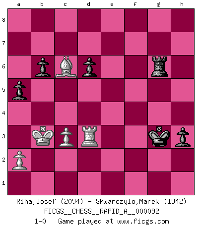 Last move : 1-0 2010 December 9 13:20:56 [Event "FICGS__CHESS__RAPID_A__000092"] [Site "FICGS"] [Date "2010.11.02"] [Round "1"] [White "Riha,Josef"] [Black "Skwarczylo,Marek"] [Result "1-0"] [WhiteElo "2094"] [BlackElo "1942"] 1.e4 c5 2.Nf3 g6 3.d4 cxd4 4.Nxd4 Nc6 5.Nc3 Bg7 6.Be3 Nf6 7.Bc4 O-O 8.Bb3 d6 9.f3 Bd7 10.Qd2 Rc8 11.h4 h5 12.O-O-O Ne5 13.Bg5 Rc5 14.f4 Nc4 15.Qd3 Ng4 16.Bxc4 Nf2 17.Qe2 Nxh1 18.Bb3 Bg4 19.Nf3 Kh8 20.f5 Rxc3 21.bxc3 Ng3 22.Qe1 gxf5 23.Qxg3 fxe4 24.Re1 f6 25.Be3 Qa5 26.Nh2 Qxc3 27.Nxg4 f5 28.Nf6 Qxf6 29.Bg5 Qd4 30.Rd1 Qb2+ 31.Kd2 Be5 32.Bf4 Bxf4+ 33.Qxf4 Qf6 34.Ke2 Qg6 35.g3 Kh7 36.Rf1 b6 37.Bd5 Rf6 38.Bc6 e5 39.Qe3 Qf7 40.Qb3 Qg6 41.Kd1 f4 42.gxf4 Rxf4 43.Re1 Rxh4 44.Kc1 Kg7 45.Kb2 e3 46.Rxe3 Rd4 47.Bd5 Kh6 48.Rc3 Qf6 49.Rc6 Rg4 50.Qa3 e4 51.c3 Rg2+ 52.Kb3 Rg6 53.Qc1+ Qg5 54.Qxg5+ Kxg5 55.Bxe4 Rh6 56.Rc7 Kf4 57.Bh1 a5 58.Rc6 Rg6 59.Rc4+ Kg3 60.Rd4 h4 61.Bc6 h3 62.Rd3+ 1-0 Sicilian : Hungarian variation Kingside Castling by player Black (move 7) Queenside Castling by player White (move 12) Player White won this chess game. Follow this game move after move (download)Good positions don't win games, good moves do. (Gerald Abrahams) Schach ist mein Leben, meine Leidenschaft, was ich gelernt habe und seit meinem 14. Lebensjahr profimässig praktiziere. Darauf zu verzichten, würde mir sehr schwer fallen. (Viktor Kortschnoi) El Ajedrez es una hermosa aventura. (Bent Larsen) On a dit que l'homme se distingue de l'animal par le fait qu'il achète plus de livres qu'il ne peut en lire. Je voudrais suggérer qu'inclure à la liste des livres quelques livres d'échecs rendrait la distinction manifeste. (Edward Lasker) 98% of all statistics are made up. (Author unknown)