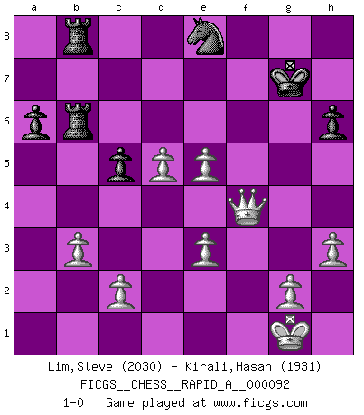 Last move : 1-0 2011 February 13 22:39:27 [Event "FICGS__CHESS__RAPID_A__000092"] [Site "FICGS"] [Date "2010.11.02"] [Round "1"] [White "Lim,Steve"] [Black "Kirali,Hasan"] [Result "1-0"] [WhiteElo "2030"] [BlackElo "1931"] 1.e4 e5 2.Nf3 Nc6 3.Bc4 Bc5 4.O-O d6 5.d3 Nf6 6.Nc3 h6 7.Be3 Bxe3 8.fxe3 O-O 9.a3 Ne7 10.d4 Ng6 11.Qd3 c6 12.a4 Qc7 13.Bb3 Re8 14.d5 Bd7 15.Nd2 Rad8 16.Rf2 Rf8 17.Raf1 c5 18.Ra1 a6 19.a5 Rb8 20.R2f1 Ne7 21.h3 Ng6 22.Qe2 Qd8 23.Ba4 Bxa4 24.Rxa4 Qc7 25.R4a1 Ne7 26.Rxf6 gxf6 27.Nc4 Nc8 28.Rf1 b5 29.axb6 Qe7 30.Na4 f5 31.Rxf5 f6 32.Qf2 Kh8 33.Rf3 Qf7 34.Qh4 Kh7 35.Nxc5 dxc5 36.Nxe5 fxe5 37.Rxf7+ Rxf7 38.Qd8 Rfb7 39.Qe8 Rxb6 40.Qxe5 Nd6 41.Qf4 Ne8 42.b3 Kg7 43.e5 1-0 Giuoco Piano Kingside Castling by player White (move 4) Kingside Castling by player Black (move 8) Player White won this chess game. Follow this game move after move (download)There are two classes of men; those who are content to yield to circumstances and who play whist; those who aim to control circumstances, and who play Chess. (Mortimer Collins) Du musst nicht gut spielen, es reicht, wenn du besser spielst als dein Gegner. (Anonymous) Todo se encuentra en un estado de flujo y esto incluye al mundo del Ajedrez. (Mikhail Botvinnik) Je ne suis pas le dernier à jouer lâchement des coups douteux pendant le zeïtnot de l'adversaire pour l'achever: en effet les coups qui font le plus peur sont ceux que l'on ne comprend pas. Je me fais souvent peur quand je joue. (Un professeur anonyme) Life is like a ten-speed bicycle: most of us have gears we never use. (Charles M. Schulz)
