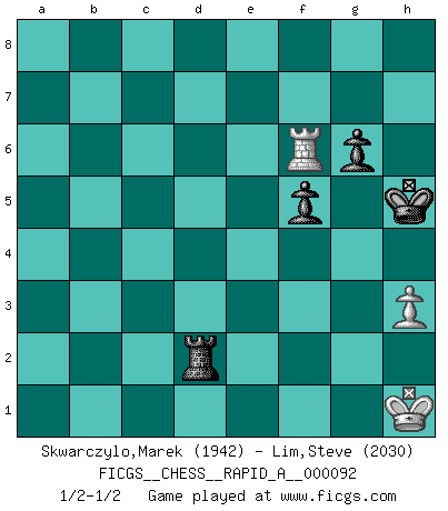 Last move : 1/2-1/2 2011 January 27 21:54:58 [Event "FICGS__CHESS__RAPID_A__000092"] [Site "FICGS"] [Date "2010.11.02"] [Round "1"] [White "Skwarczylo,Marek"] [Black "Lim,Steve"] [Result "1/2-1/2"] [WhiteElo "1942"] [BlackElo "2030"] 1.d4 d5 2.Nf3 e6 3.c4 c6 4.e3 Nf6 5.Nc3 Nbd7 6.Bd3 dxc4 7.Bxc4 b5 8.Bd3 Bb7 9.e4 b4 10.Na4 c5 11.O-O cxd4 12.Nxd4 Bd6 13.f3 O-O 14.Be3 Qb8 15.h3 Nh5 16.Ne2 Ne5 17.f4 Nxd3 18.Qxd3 Bc6 19.e5 Be7 20.Bc5 Bxc5+ 21.Nxc5 Bb5 22.Qf3 Qb6 23.Qxh5 Qxc5+ 24.Rf2 Qb6 25.a4 bxa3 26.Rxa3 Rfd8 27.Qf3 Rac8 28.Rc3 Bxe2 29.Qxe2 Rxc3 30.bxc3 a5 31.Kh2 a4 32.Qf3 g6 33.c4 h5 34.Ra2 Qb3 35.Qe2 a3 36.c5 h4 37.c6 Qg3+ 38.Kh1 Qxf4 39.Ra1 Rd2 40.Qf3 Qxe5 41.Qxa3 Qd5 42.Qf3 Qxf3 43.gxf3 Rc2 44.Ra4 Rxc6 45.Rxh4 Rc2 46.Kg1 Kg7 47.Ra4 Kf6 48.Rf4+ Kg7 49.Ra4 Rb2 50.Rc4 e5 51.f4 exf4 52.Rxf4 f5 53.Ra4 Kh6 54.Ra6 Rd2 55.Rf6 Kh5 56.Kh1 Rc2 57.Kg1 Rd2 58.Kh1 Kg5 59.Ra6 Kh5 60.Rf6 1/2-1/2 Queen's pawn game Kingside Castling by player White (move 11) Kingside Castling by player Black (move 13) 10 pieces endgame at move 44 : White KRPP , Black KRPPPP WHITE : King + 1 Rook 2 Pawns BLACK : King + 1 Rook 4 Pawns 9 pieces endgame at move 45 : White KRPP , Black KRPPP WHITE : King + 1 Rook 2 Pawns BLACK : King + 1 Rook 3 Pawns 8 pieces endgame at move 51 : White KRP , Black KRPPP WHITE : King + 1 Rook 1 Pawn BLACK : King + 1 Rook 3 Pawns 7 pieces endgame at move 52 : White KRP , Black KRPP WHITE : King + 1 Rook 1 Pawn BLACK : King + 1 Rook 2 Pawns This chess game ended in a draw. Follow this game move after move (download)You are for me the Queen on d8 and I am the Pawn on d7 !! (Eduard Gufeld) Schach ist die gewalttätigste aller Sportarten. (Garry Kasparov) El Ajedrez es un expediente tonto que hace creer a la gente inactiva que hacen una cosa muy astuta cuando solamente estan perdiendo su tiempo. (George Bernard Shaw) Shah mat. Le roi est mort. Cri de fierté d'un joueur venant de terrasser son adversaire, courtoisement, sans effusion de sang. Nowadays, anyone who cannot speak English and is incapable of using the Internet is regarded as backward. (Al-Waleed bin Talal)
