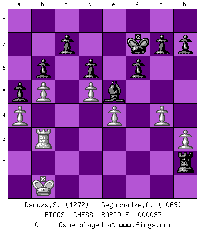 Last move : 0-1 2010 December 26 14:50:28 [Event "FICGS__CHESS__RAPID_E__000037"] [Site "FICGS"] [Date "2010.11.03"] [Round "1"] [White "Dsouza,Stanislaus"] [Black "Geguchadze,Alexander"] [Result "0-1"] [WhiteElo "1272"] [BlackElo "1069"] 1.e4 e5 2.Nf3 Nc6 3.d4 exd4 4.Nxd4 Qh4 5.Nc3 Bc5 6.Be3 Nf6 7.Qf3 Nxd4 8.Bxd4 Bxd4 9.O-O-O Qxf2 10.Qxf2 Bxf2 11.Bc4 O-O 12.Rhf1 Be3+ 13.Kb1 d6 14.Rd3 Bc5 15.Rg3 Kh8 16.a3 Bd7 17.Rgf3 Kg8 18.h3 Be6 19.Bd3 Nd7 20.Nd5 Ne5 21.Rf4 Bxd5 22.exd5 Nxd3 23.cxd3 Rae8 24.b4 Bb6 25.a4 a5 26.b5 Re2 27.g4 Rh2 28.R1f3 Re8 29.Re4 Rxe4 30.dxe4 f6 31.Rg3 Kf7 32.Rf3 Bd4 33.Rd3 Be5 34.Rb3 b6 0-1 Scotch : Steinitz variation Queenside Castling by player White (move 9) Kingside Castling by player Black (move 11) Player Black won this chess game. Follow this game move after move (download)When you don't know what to play, wait for an idea to come into your opponent's mind. You may be sure that idea will be wrong. (Siegbert Tarrasch) Ich hatte Angst gegen einen russischen Großmeister zu verlieren, und er befürchtete gegen einen kleinen Jungen zu verlieren. (über ein Remis gegen Juri Awerbach). (Robert James Fischer) Bobby Fischer es el jugador de Ajedrez mas grande que jamás haya existido. (Ken Smith) Le pion, dans sa simplicité, marche droit devant lui, mais lorsqu'il prend, il le fait obliquement? Ainsi l'homme, tant qu'il reste pauvre, marche dans la droiture et vit honnêtement, mais lorsqu'il recherche les honneurs, il flatte, se parjure et, par les voies obliques, cherche une position supérieure sur l'échiquier du monde. (Jean de Galles) Everybody lies. (Gregory House, House M.D.)