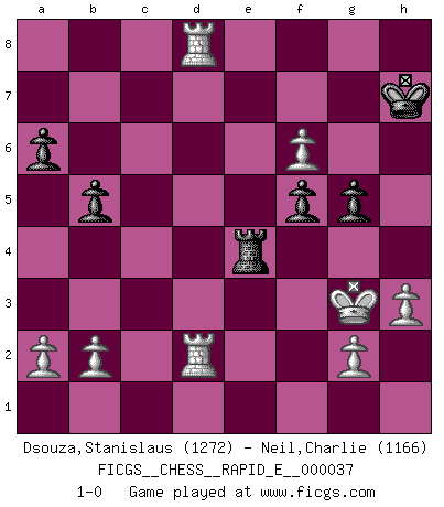 Last move : 1-0 2011 January 15 10:26:17 [Event "FICGS__CHESS__RAPID_E__000037"] [Site "FICGS"] [Date "2010.11.03"] [Round "1"] [White "Dsouza,Stanislaus"] [Black "Neil,Charlie"] [Result "1-0"] [WhiteElo "1272"] [BlackElo "1166"] 1.e4 c5 2.Nf3 d6 3.d4 cxd4 4.Qxd4 Nc6 5.Qd1 Bg4 6.Nc3 Nf6 7.Qd3 e6 8.Bg5 Be7 9.Nd4 O-O 10.Be2 Bxe2 11.Ncxe2 a6 12.O-O Rc8 13.Nxc6 Rxc6 14.Nd4 Rc8 15.c3 h6 16.Bh4 Qc7 17.h3 Qc4 18.Qxc4 Rxc4 19.f3 g5 20.Bf2 R4c8 21.Nc2 Rfd8 22.Rfd1 d5 23.e5 Nd7 24.Bg3 Bf8 25.f4 Nc5 26.fxg5 hxg5 27.Ne3 Ne4 28.Bf2 Nxf2 29.Kxf2 Bg7 30.Ng4 b5 31.Rd3 Rc4 32.Re1 Rf4+ 33.Kg3 d4 34.Red1 Re4 35.cxd4 Re2 36.R1d2 Re4 37.d5 exd5 38.Rxd5 f5 39.Rxd8+ Kh7 40.Nf6+ Bxf6 41.exf6 1-0 Sicilian, Chekhover variation Kingside Castling by player Black (move 9) Kingside Castling by player White (move 12) Player White won this chess game. Follow this game move after move (download)The winner of the game is the player who makes the next-to-last mistake. (Savielly Tartakover) Der Bart als Geschlechtszeichen mitten im Gesicht ist obszön. Daher gefällt er den Weibern. [Zugegeben, kein Schachzitat, aber unglaublich originell] (Arthur Schopenhauer) Cuando tu no sabes absolutamente que mas hacer, es tiempo de entrar en pánico. (John van der Wiel) Lorsque vous vous retrouvez devant une position atroce, ne tendez pas un ultime piège dérisoire avec l'intention d'abandonner si l'adversaire le déjoue ! Faites-vous plutôt un devoir de résister comme si votre vie en dépendait. Jouez le coup qui vous déplairait au centuple si vous étiez dans la peau de votre tortionnaire ! Logic : The art of thinking and reasoning in strict accordance with the limitations and incapacities of the human misunderstanding. (Ambrose Bierce)