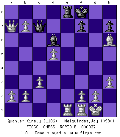 Last move : 1-0 2010 November 14 19:44:35 [Event "FICGS__CHESS__RAPID_E__000037"] [Site "FICGS"] [Date "2010.11.03"] [Round "1"] [White "Quanter,Kirsty"] [Black "Melquiades,Jay"] [Result "1-0"] [WhiteElo "1106"] [BlackElo "0980"] 1.e4 e5 2.Nf3 d6 3.d4 Nc6 4.d5 Bg4 5.h3 Bxf3 6.Qxf3 Nd4 7.Qd3 Nf6 8.c3 Nc2+ 9.Qxc2 Be7 10.Bb5+ c6 11.dxc6 O-O 12.cxb7 Rb8 13.Bc6 Qc7 14.Qa4 d5 15.exd5 e4 16.Qxa7 e3 17.Bxe3 Ne4 18.Nd2 Nxd2 19.Bxd2 Rbe8 20.Bxe8 Rxe8 21.O-O g5 22.Rae1 Kf8 23.Bxg5 Bd6 24.Bh6+ 1-0 Philidor's defense Kingside Castling by player Black (move 11) Kingside Castling by player White (move 21) Player White won this chess game. Follow this game move after move (download)Tactics flow from a superior position. (Bobby Fischer) Irgendwie scheint mir sonntags früh um 9 Uhr der Killerinstinkt verloren gegangen zu sein. (Alexej Shirov) El Ajedrez es en su esencia, un juego. En su forma, un arte. Y en su ejecución, una ciencia. (Baron Tassilo) Si rien de grave n'est détecté lors de l'analyse d'une position, on joue alors le coup. Seconde règle de Blumenfeld. There are three kinds of lies: lies, damned lies and statistics. (Mark Twain)