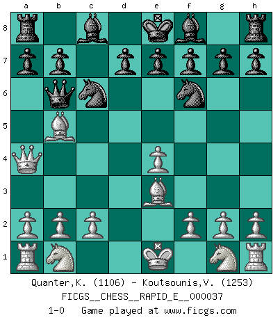 Last move : 1-0 2010 December 8 10:25:24 [Event "FICGS__CHESS__RAPID_E__000037"] [Site "FICGS"] [Date "2010.11.03"] [Round "1"] [White "Quanter,Kirsty"] [Black "Koutsounis,Vassilios"] [Result "1-0"] [WhiteElo "1106"] [BlackElo "1253"] 1.e4 c5 2.d4 cxd4 3.Qxd4 Nc6 4.Qa4 Qb6 5.Bb5 Nf6 6.Be3 1-0 This chess game has been lost on time (started : 2010.11.03 7:57:16) Sicilian : Smith-Morra gambit Player White won this chess game. Follow this game move after move (download)If your opponent offers you a draw, try to work out why he thinks he's worse off. (Nigel Short) Das Zentrum ist der Balkan des Schachbretts - Kriegshandlungen können in jedem Moment ausbrechen. (Aaron Nimzowitsch) Debes de llevar a tu oponente hacia un profundo y obscuro bosque donde 2+2=5, y el camino que conduce a la salida es suficientemente ancho para solamente uno. (Mikhail Tal) Nous sommes les pions de la mystérieuse partie d'Echecs jouée par Dieu. Il nous déplace, nous arrête, nous pousse encore, puis nous lance un à un dans la boîte du Néant. Epitaphe sur la tombe de David Janowsky (1868-1927). I have opinions of my own - strong opinions - but I don't always agree with them. (George Bush)