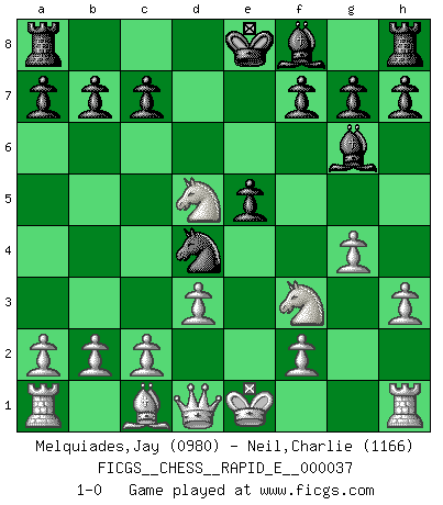 Last move : 1-0 2010 November 11 13:2:31 [Event "FICGS__CHESS__RAPID_E__000037"] [Site "FICGS"] [Date "2010.11.03"] [Round "1"] [White "Melquiades,Jay"] [Black "Neil,Charlie"] [Result "1-0"] [WhiteElo "0980"] [BlackElo "1166"] 1.e4 e5 2.Nf3 Nf6 3.Bc4 Nc6 4.Nc3 Nxe4 5.Nxe4 d5 6.Bxd5 Qxd5 7.d3 Bg4 8.h3 Bh5 9.g4 Bg6 10.Nc3 Nd4 11.Nxd5 1-0 Petrov : Italian variation Player White won this chess game. Follow this game move after move (download)Bobby Fischer's current state of mind is indeed a tragedy. One of the world's greatest Chess players - the pride and sorrow of American Chess. (Frank Brady) Ein bischen Romantik kann weder im Schach noch in der Liebe schaden. Also versuche ich mich ab und zu daran zu erinnern. (Nigel Short) Aquellos que dicen que entienden al Ajedrez, no entienden nada. (Robert Hubner) Nous vivons dans un monde échiquéen : chaque jour qui passe est un défi à relever. (Philosophe Sasha) Men should grow up. - Yeah. And dogs should stop licking themselves. It's not gonna happen. (Gregory House to Dr. Cameron, House M.D.)