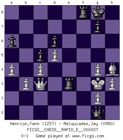 Last move : 0-1 2010 November 22 8:32:37 [Event "FICGS__CHESS__RAPID_E__000037"] [Site "FICGS"] [Date "2010.11.03"] [Round "1"] [White "Henrion,Yann"] [Black "Melquiades,Jay"] [Result "0-1"] [WhiteElo "1257"] [BlackElo "0980"] 1.e4 e5 2.Nf3 d6 3.d4 Nc6 4.d5 Nb4 5.Bd2 a5 6.a3 Na6 7.Bxa6 bxa6 8.Bxa5 Nf6 9.Nc3 Bb7 10.O-O Rb8 11.b3 Be7 12.Qd2 Qd7 13.a4 c5 14.Nd1 Nxe4 15.Qd3 f5 16.c4 h5 17.Ne3 h4 18.h3 Ng5 19.Nxg5 Bxg5 20.Bd2 e4 21.Qe2 f4 22.Ng4 O-O 23.Qxe4 Rbe8 24.Qd3 Qf7 25.f3 Bc8 26.Rae1 Bf5 27.Qc3 Bxg4 28.fxg4 f3 29.Bxg5 f2+ 30.Kh2 Rxe1 31.Rxf2 Qxf2 32.Bxh4 Qg1+ 33.Kg3 Re3+ 0-1 Philidor's defense Kingside Castling by player White (move 10) Kingside Castling by player Black (move 22) Player Black won this chess game. Follow this game move after move (download)Chess is a part of culture and if a culture is declining then Chess too will decline. (Mikhail Botvinnik) Das Schachspiel hat wie die Liebe, die Musik, die Fähigkeit, den Menschen glücklich zu machen. Ich habe ein leises Gefühl des Bedauerns für jeden, der das Schachspiel nicht kennt, so wie ich jeden bedaure, der die Liebe nicht kennt. (Siegbert Tarrasch) Cuando tengas duda... ¡juega al Ajedrez!. (Tevis) Tous ces prétendus hommes politiques sont les pions, les Cavaliers, les Tours ou les Fous d'une partie d'échecs qui se jouera tant qu'un hasard ne renversera pas l'échiquier. (Honoré de Balzac) The ego is not master in its own house. (Sigmund Freud)
