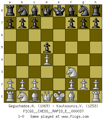 Last move : 1-0 2010 December 7 10:23:34 [Event "FICGS__CHESS__RAPID_E__000037"] [Site "FICGS"] [Date "2010.11.03"] [Round "1"] [White "Geguchadze,Alexander"] [Black "Koutsounis,Vassilios"] [Result "1-0"] [WhiteElo "1069"] [BlackElo "1253"] 1.e4 e6 2.d4 d5 3.exd5 exd5 4.Nf3 1-0 This chess game has been lost on time (started : 2010.11.03 7:57:16) French : Exchange variation Player White won this chess game. Follow this game move after move (download)Let the perfectionist play postal. (Yasser Seirawan) Man wirke der falschen Auffassung entgegen, als ob jeder Zug Unmittelbares zu leisten habe; auch Werte- und Ruhezüge haben ihre Existenzberechtigung. (Aaron Nimzowitsch) El jugador táctico debe saber que hacer cuando algo se debe de hacer. El estratégico debe saber que hacer cuando nada se debe de hacer. (Savielly Tartakover) On est toujours la mazette de quelqu'un d'autre. (Anonyme) Everything in life is luck. (Donald Trump)