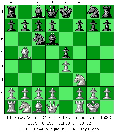 Last move : 1-0 2007 January 7 16:45:54 [Event "FICGS__CHESS__CLASS_D__000020"] [Site "FICGS"] [Date "2006.11.28"] [Round "1"] [White "Miranda,Marcus"] [Black "Castro,Emerson"] [Result "1-0"] [WhiteElo "1400"] [BlackElo "1500"] 1.e4 e5 2.Nf3 Nc6 3.Bb5 Bd6 4.O-O 1-0 This chess game has been lost on time (started : 2006.11.28 3:33:45) Ruy Lopez (Spanish Opening) Kingside Castling by player White (move 4) Player White won this chess game. Follow this game move after move (download)Openings teach you openings. Endgames teach you chess ! (Stephan Gerzadowicz) Der zweitbeste Zug ist oft der einzig richtige. (Savielly Grigorievitsch Tartakower) El Ajedrez te enseña a controlarl la excitación inicial que sientes cuando vez algo que parece bueno y te enseña a pensar objetivamente cuando te encuentras en problemas. (Stanley Kubrick) Karpov est une pièce de musée. (Garry Kasparov) Luck never made a man wise. (Seneca, Letters to Lucilius)