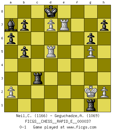Last move : 0-1 2011 January 18 23:35:8 [Event "FICGS__CHESS__RAPID_E__000037"] [Site "FICGS"] [Date "2010.11.03"] [Round "1"] [White "Neil,Charlie"] [Black "Geguchadze,Alexander"] [Result "0-1"] [WhiteElo "1166"] [BlackElo "1069"] 1.d4 d5 2.c4 c6 3.Nc3 Nf6 4.Bg5 Nbd7 5.cxd5 Nxd5 6.e4 Nxc3 7.bxc3 g6 8.Bc4 Qa5 9.Ne2 Qxg5 10.O-O Bh6 11.f4 Qa5 12.Qb3 f5 13.Bf7+ Kf8 14.exf5 Qxf5 15.Be6 Qb5 16.Qxb5 cxb5 17.d5 Nc5 18.Bxc8 Rxc8 19.g4 Ke8 20.g5 Bg7 21.Rfd1 Ne4 22.Rac1 Nxc3 23.Nxc3 Rxc3 24.Rb1 a6 25.d6 Rf8 26.d7+ Kd8 27.Rd5 Rxf4 28.Re1 Bd4+ 29.Kg2 Rf2+ 30.Kh1 Ba7 31.Rxe7 Rf1+ 32.Kg2 Rg1+ 0-1 QGD Slav defense Kingside Castling by player White (move 10) Player Black won this chess game. Follow this game move after move (download)Many Chess players were surprised when after the game, Fischer quietly explained: 'I had already analyzed this possibility' in a position which I thought was not possible to foresee from the opening. (Mikhail Tal) Die unerbitterlichsten Regeln im Schach sind die Ausnahmen. (Savielly Grigorievitsch Tartakower) Cada Peón es potencialmente una Reina. (James Mason) Les pièces de l'échiquier étaient impitoyables. Elles le retenaient, elles l'absorbaient. Il y avait de l'horreur en cela, mais aussi une harmonie unique. Car, qu'y a-t-il dans le monde, à part les échecs ? (V. Nabokov) Perhaps the current trend of many chess professionals taking up the more lucrative pastime of poker is not a wholly negative one. It may not be too late for humans to relearn how to take risks in order to innovate and thereby maintain the advanced lifestyles we enjoy. And if it takes a poker-playing supercomputer to remind us that we can't enjoy the rewards without taking the risks, so be it. (The Chess Master and the Computer, by Garry Kasparov - 2010)