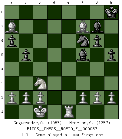 Last move : 1-0 2010 December 14 8:13:19 [Event "FICGS__CHESS__RAPID_E__000037"] [Site "FICGS"] [Date "2010.11.03"] [Round "1"] [White "Geguchadze,Alexander"] [Black "Henrion,Yann"] [Result "1-0"] [WhiteElo "1069"] [BlackElo "1257"] 1.e4 e5 2.Nf3 Nc6 3.d4 Nxd4 4.Nxd4 exd4 5.Qxd4 d6 6.Nc3 Nf6 7.Bf4 g6 8.e5 c5 9.Qd2 dxe5 10.Qxd8+ Kxd8 11.Bxe5 Bg7 12.O-O-O Ke8 13.Bb5+ Kf8 14.Rhe1 a6 15.Bc4 h5 16.Bd6+ Kg8 17.Bxc5 b5 18.Rd8+ Kh7 19.Rxh8+ Kxh8 20.Bxf7 Bf5 21.Bd4 Ra7 22.Bxa7 1-0 Scotch : Lolli variation Queenside Castling by player White (move 12) Player White won this chess game. Follow this game move after move (download)One doesn't have to play well, it's enough to play better than your opponent. (Siegbert Tarrasch) Den Ruhm habe ich schon, jetzt brauche ich noch das Geld. (Wilhelm Steinitz) El juego del Ajedrez no es solamente una diversión quieta; algunas cualidades muy valuables de la mente se pueden adquirir y cultivar con el, como convertirlos en habitos disponibles para toda ocasión; ya que la vida es algo así como el Ajedrez. (Benjamin Franklin) Le thème de l'attaque double intervient d'une manière ou d'une autre dans l'immense majorité des combinaisons. (Youri Averbakh) Imagination is more important than knowledge. Knowledge is limited. Imagination encircles the world. (Albert Einstein)