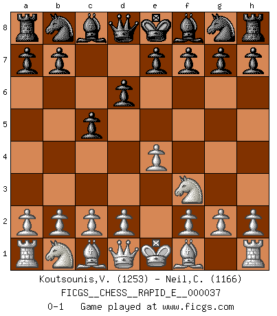 Last move : 0-1 2010 December 5 22:28:7 [Event "FICGS__CHESS__RAPID_E__000037"] [Site "FICGS"] [Date "2010.11.03"] [Round "1"] [White "Koutsounis,Vassilios"] [Black "Neil,Charlie"] [Result "0-1"] [WhiteElo "1253"] [BlackElo "1166"] 1.e4 c5 2.Nf3 d6 0-1 This chess game has been lost on time (started : 2010.11.03 7:57:16) Sicilian Player Black won this chess game. Follow this game move after move (download)Whoever sees no other aim in the game than that of giving checkmate to one's opponent will never become a good Chess player. (Euwe) Ein Springer auf f6 gegen die eigene Rochadestellung ist schlimmer als ein rostiger Nagel im Knie. (Efim Bogoljubov) El Ajedrez es una guerra en un tablero. El objetivo es aplastar la mente del oponente. (Bobby Fischer) Des idées, des idées, j'en ai cent, j'en ai mille. Des bonnes, des mauvaises, applicables, irréalisables... Il suffit de faire le tri ! (Roos) Programming can only do so much before it becomes too much. (Don Groves)