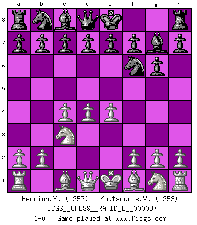 Last move : 1-0 2010 December 6 22:24:28 [Event "FICGS__CHESS__RAPID_E__000037"] [Site "FICGS"] [Date "2010.11.03"] [Round "1"] [White "Henrion,Yann"] [Black "Koutsounis,Vassilios"] [Result "1-0"] [WhiteElo "1257"] [BlackElo "1253"] 1.c4 Nf6 2.d4 g6 3.Nc3 Bg7 4.e4 1-0 This chess game has been lost on time (started : 2010.11.03 7:57:16) English, 1...Nf6 (Anglo-Indian defense) Player White won this chess game. Follow this game move after move (download)I'm not a materialistic person, in that, I don't suffer the lack or loss of money. The absence of worldly goods I don't look back on. For Chess is a way I can be as materialistic as I want without having to sell my soul. (Jamie Walter Adams) Wenn ich einen Club besuche, sind die Spieler stumm vor Staunen. (José Raúl Capablanca) Cuando tu no sabes absolutamente que mas hacer, es tiempo de entrar en pánico. (John van der Wiel) Des points faibles ou des trous dans la position de l'adversaire doivent être occupés par des pièces et non pas par des pions. (Siegbert Tarrasch) To err is human, but to really foul things up requires a computer. (Farmer's Almanac, 1978)
