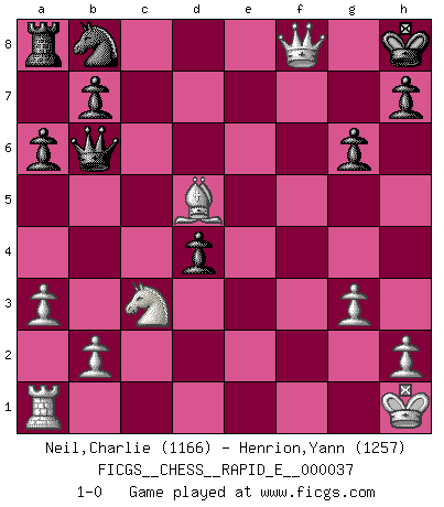 Last move : 1-0 2010 December 21 11:13:51 [Event "FICGS__CHESS__RAPID_E__000037"] [Site "FICGS"] [Date "2010.11.03"] [Round "1"] [White "Neil,Charlie"] [Black "Henrion,Yann"] [Result "1-0"] [WhiteElo "1166"] [BlackElo "1257"] 1.c4 g6 2.g3 Bg7 3.Bg2 Nf6 4.Nc3 e6 5.e4 O-O 6.d4 c6 7.Nge2 d5 8.cxd5 exd5 9.e5 Bg4 10.f3 Bxf3 11.Bxf3 Nfd7 12.Bf4 Re8 13.Qd2 f6 14.exf6 Bxf6 15.O-O Qb6 16.Bg4 a6 17.a3 Bg7 18.Bd6 c5 19.Bxc5 Nxc5 20.dxc5 Qxc5+ 21.Kh1 Bxc3 22.Nxc3 d4 23.Qh6 Qc6+ 24.Bf3 Qb6 25.Bd5+ Kh8 26.Rf8+ Rxf8 27.Qxf8+ 1-0 English Opening Kingside Castling by player Black (move 5) Kingside Castling by player White (move 15) Player White won this chess game. Follow this game move after move (download)Best by test: 1. e4 (Bobby Fischer) Sie führen leise Selbstgespräche, schlürfen lautstark ihre Getränke, schmatzen hörbar beim Essen, blasen ihrem Gegenüber Rauch in die Augen, niesen ihm ins Gesicht, starren ihn unverwandt an, bis er sich unter ihren Blicken windet, rutschen ständig auf ihrem Stuhl hin und her, rülpsen und bohren in der Nase. (Anonymous) La belleza de un movimiento no se refleja solo en su apariencia, sino en el pensamiento detrás de él. (Siegbert Tarrasch) Les Echecs sont et restent toujours un combat, un combat intégral comme la boxe, la lutte ou un autre sport, et où il doit y avoir un vainqueur et un vaincu. (Joseph Emil Diemer) Inventor: A person who makes an ingenious arrangement of wheels, levers and springs, and believes it civilization. (Ambrose Bierce, The Devil's Dictionary)