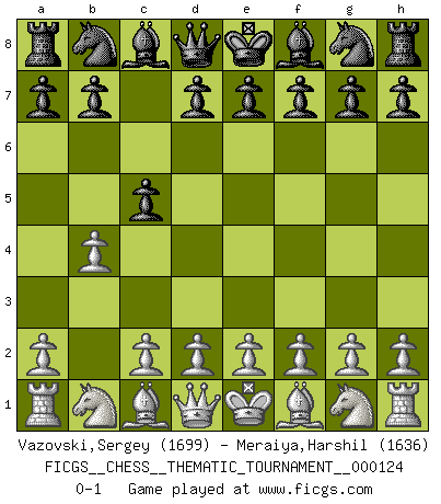 Last move : 0-1 2010 December 14 10:32:50 [Event "FICGS__CHESS__THEMATIC_TOURNAMENT__000124"] [Site "FICGS"] [Date "2010.11.03"] [Round "1"] [White "Vazovski,Sergey"] [Black "Meraiya,Harshil"] [Result "0-1"] [WhiteElo "1699"] [BlackElo "1636"] 1.b4 c5 0-1 This chess game has been lost on time (started : 2010.11.03 23:27:40) Polish (Sokolsky) opening Player Black won this chess game. Follow this game move after move (download)When your house is on fire, you can't be bothered with the neighbors. Or, as we say in Chess, if your King is under attack you don't worry about losing a Pawn on the Queen's side. (Gary Kasparov) Schach ist das Spiel, das die Verrückten gesund hält. (Albert Einstein) Si pudieramos observar el interior de la cabeza de un jugador de Ajedrez, encontraríamos ahí un mundo lleno de sentimientos, imágenes, ideas, emoción y pasión. (Alfred Binet) Les échecs sont un jeu par leur forme, un art par leur essence et une science par sa difficulté d'acquisition. Ils peuvent vous procurer autant de plaisir qu'un bon livre ou une belle musique, mais vous n'aurez une réelle joie que si vous arrivez à bien jouer. (Tigran Petrosian) Don't be discouraged. It's often the last key in the bunch that opens the lock. (Author unknown)