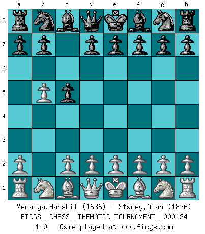 Last move : 1-0 2010 December 19 10:41:44 [Event "FICGS__CHESS__THEMATIC_TOURNAMENT__000124"] [Site "FICGS"] [Date "2010.11.03"] [Round "1"] [White "Meraiya,Harshil"] [Black "Stacey,Alan"] [Result "1-0"] [WhiteElo "1636"] [BlackElo "1876"] 1.b4 c5 2.b5 1-0 This chess game has been lost on time (started : 2010.11.03 23:27:40) Polish (Sokolsky) opening Player White won this chess game. Follow this game move after move (download)I have never in my life played the French Defence, which is the dullest of all openings. (Wilhelm Steinitz) Vom Schach wurde gesagt das Leben sei dafür nicht lange genug. Aber das ist der Fehler des Lebens, nicht des Schach'. (Irving Chernev) Una buena ofensiva y una buena defensa, comienzan ambas con un buen desarrollo. (Bruce A. Moon) J'ai vu le vaincu d'Echecs jouer des années durant dans l'espoir de la fête de la victoire. Car tu es plus riche de ce qu'elle existe si même elle n'est point pour toi. Ainsi de la perle du fond des mers. (Antoine de Saint-Exupéry) Without deviation from the norm, progress is not possible. (Frank Zappa)