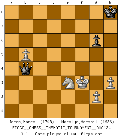 Last move : 0-1 2010 December 12 7:42:28 [Event "FICGS__CHESS__THEMATIC_TOURNAMENT__000124"] [Site "FICGS"] [Date "2010.11.03"] [Round "1"] [White "Jacon,Marcel"] [Black "Meraiya,Harshil"] [Result "0-1"] [WhiteElo "1743"] [BlackElo "1636"] 1.b4 c5 2.bxc5 e5 3.e3 Bxc5 4.Bb2 d6 5.d4 exd4 6.exd4 Bb6 7.Nf3 Ne7 8.Nbd2 O-O 9.Bb5 Bd7 10.c4 Bxb5 11.cxb5 Nf5 12.O-O d5 13.Qb3 a6 14.a4 axb5 15.axb5 Rxa1 16.Rxa1 Re8 17.h3 h6 18.Ra8 Bc7 19.Ba3 b6 20.Ra7 Bf4 21.Bb4 Bd6 22.Bxd6 Qxd6 23.Qc2 Qf4 24.Nb3 g6 25.Ne5 Nxd4 26.Nxd4 Qxe5 27.Qc7 Qe1+ 28.Kh2 Qxf2 29.Nf3 Rf8 30.Qf4 h5 31.Rb7 h4 32.Qd6 Re8 33.Ng5 d4 34.Nxf7 Qg3+ 35.Qxg3 hxg3+ 36.Kxg3 d3 37.Nh6+ Kh8 38.Ng4 Rf8 39.Rxb6 Rd8 40.Kf2 d2 41.Rxb8 d1Q 42.Rxd8+ Qxd8 43.Ne3 Qd2+ 44.Kf3 Qb4 0-1 Polish (Sokolsky) opening Kingside Castling by player Black (move 8) Kingside Castling by player White (move 12) 10 pieces endgame at move 41 : White KRNPPP , Black KRPP WHITE : King + 1 Rook 1 Knight 3 Pawns BLACK : King + 1 Rook 2 Pawns Promotion Queen by player Black (move 41) 9 pieces endgame at move 42 : White KRNPPP , Black KQP WHITE : King + 1 Rook 1 Knight 3 Pawns BLACK : King + 1 Queen 1 Pawn 8 pieces endgame at move 42 : White KNPPP , Black KQP WHITE : King + 1 Knight 3 Pawns BLACK : King + 1 Queen 1 Pawn Player Black won this chess game. Follow this game move after move (download)The most powerful weapon in Chess is to have the next move. (David Bronstein) Karpov ist ein Museumsstück. (Garry Kasparov) Una victoria por una combinación errónea, aunque sea espectacular, me llena de horror artístico. (Wilhelm Steinitz) Aux échecs, l'amour-propre est satisfait quand on remporte la victoire, mais il n'y a pas de honte à être battu. (Benjamin Franklin) Tree pose grows confidence. It roots me to this world. (Terri Guillemets)