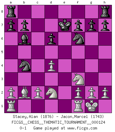 Last move : 0-1 2011 January 10 10:46:17 [Event "FICGS__CHESS__THEMATIC_TOURNAMENT__000124"] [Site "FICGS"] [Date "2010.11.03"] [Round "1"] [White "Stacey,Alan"] [Black "Jacon,Marcel"] [Result "0-1"] [WhiteElo "1876"] [BlackElo "1743"] 1.b4 c5 2.bxc5 e5 3.e3 Bxc5 4.Bb2 d6 5.d4 exd4 6.exd4 Bb6 7.Nf3 Nf6 8.Bb5+ Bd7 9.Qe2+ Qe7 10.Bxd7+ Kxd7 11.Qxe7+ Kxe7 12.Nbd2 Nc6 13.O-O Nb4 0-1 Polish (Sokolsky) opening Kingside Castling by player White (move 13) Player Black won this chess game. Follow this game move after move (download)I am the best player in the world and I am here to prove it. (Bobby Fischer) Schach ist ein Kampf gegen den Fehler. (Johannes Herrman Zukertort) Dios mío, Bobby Fischer juega tan simple. (Alexei Suetin) Les réformistes prétendent que les progrès de la théorie conduiront à la disparition des échecs, et qu'il faut, pour leur rendre vie, en remanier les règles. En réalité, qu'exprime cette affirmation? Le mépris de l'intuition, de l'imagination et de tous les autres éléments qui font des échecs un art. (Alexander Alekhine) Fear is the path to the dark side. Fear leads to anger; anger leads to hate; hate leads to suffering. I sense much fear in you. (Master Yoda in Star Wars ep.1)