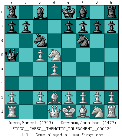 Last move : 1-0 2010 December 15 10:35:55 [Event "FICGS__CHESS__THEMATIC_TOURNAMENT__000124"] [Site "FICGS"] [Date "2010.11.03"] [Round "1"] [White "Jacon,Marcel"] [Black "Gresham,Jonathan"] [Result "1-0"] [WhiteElo "1743"] [BlackElo "1472"] 1.b4 c5 2.bxc5 Nf6 3.d4 d5 4.Nc3 Qa5 5.Bd2 Nc6 6.Nxd5 1-0 This chess game has been lost on time (started : 2010.11.03 23:27:40) Polish (Sokolsky) opening Player White won this chess game. Follow this game move after move (download)It began to feel as though you were playing against Chess itself. - On playing against Robert Fischer. (Walter Shipman) Nach Morphy wurde nichts neues mehr in der Behandlung offener Positionen gefunden. (Mikhail Moiseyevich Botvinik) Cuando tu casa esta en llamas, no puedes ser molestado por tus vecinos. O, como decinos en Ajedrez, si tu Rey esta bajo ataque, no te preocupa perder un Peón del lado de la Reina. (Gary Kasparov) Des idées, des idées, j'en ai cent, j'en ai mille. Des bonnes, des mauvaises, applicables, irréalisables... Il suffit de faire le tri ! (Roos) Dave, my mind is going. I can feel it. (HAL 9000 in 2001, a space odyssey)