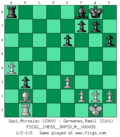 Last move : 1/2-1/2 2010 December 8 15:30:9 [Event "FICGS__CHESS__RAPID_M__000035"] [Site "FICGS"] [Date "2010.11.04"] [Round "1"] [White "Gazi,Miroslav"] [Black "Germanes,Ramil"] [Result "1/2-1/2"] [WhiteElo "2300"] [BlackElo "2101"] 1.d4 Nf6 2.c4 e6 3.Nf3 d5 4.Nc3 c6 5.e3 Nbd7 6.Qc2 Bd6 7.Bd3 O-O 8.O-O dxc4 9.Bxc4 b5 10.Be2 Bb7 11.Rd1 Qc7 12.Bd2 a6 13.b4 a5 14.Rdc1 Bxb4 15.Nxb5 Qb8 16.Nc3 c5 17.Rab1 h6 18.Qb2 cxd4 19.Nxd4 Ne4 20.Nxe4 Bxe4 21.Ra1 Bc5 22.Nb5 a4 23.a3 Bc6 24.Bf1 Qb6 25.Bc3 Rfb8 26.Rab1 Bf8 27.Qc2 Nc5 28.Nd4 Nb3 29.Nxc6 Qxc6 30.Bb2 Qxc2 31.Rxc2 Rc8 32.Bd3 Rxc2 33.Bxc2 Rc8 34.Bxb3 axb3 35.a4 Ra8 1/2-1/2 Queen's pawn game Kingside Castling by player Black (move 7) Kingside Castling by player White (move 8) This chess game ended in a draw. Follow this game move after move (download)Even the laziest King flees wildly in the face of a double check ! (Aaron Nimzowitsch) Je älter ich werde, um so mehr schätze ich die Bauern. (Paul Keres) Nunca nadie ha ganado una partida de Ajedrez rindiendose. (Unknown) Les Echecs, c'est l'art de la guerre sans les charniers, c'est la résurrection des morts tombés au champ d'honneur, l'espoir perpétuel, la suprématie de l'intelligence sur la force, la culture de l'esprit. (F. Szpiner) When a man with money meets a man with experience, the man with experience leaves with money and the man with money leaves with experience. (Anonymous)