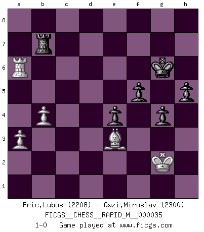 Last move : 1-0 2011 June 28 7:22:51 [Event "FICGS__CHESS__RAPID_M__000035"] [Site "FICGS"] [Date "2010.11.04"] [Round "1"] [White "Fric,Lubos"] [Black "Gazi,Miroslav"] [Result "1-0"] [WhiteElo "2208"] [BlackElo "2300"] 1.d4 Nf6 2.c4 e6 3.Nf3 b6 4.g3 Bb7 5.Bg2 Be7 6.Nc3 d5 7.O-O O-O 8.cxd5 Nxd5 9.Qc2 c5 10.dxc5 bxc5 11.Rd1 Nd7 12.e4 Nb4 13.Qa4 Bc6 14.Qb3 a5 15.Rd2 Rb8 16.Qd1 Qc8 17.a3 Na6 18.Rc2 Bf6 19.Qe1 Nc7 20.e5 Bd8 21.Nd2 Bxg2 22.Kxg2 Nd5 23.Nc4 a4 24.Bd2 Qc6 25.Kg1 N7b6 26.Na5 Qa8 27.Ne4 Nd7 28.Nc4 Bc7 29.Bc3 Rfd8 30.Rd1 h6 31.Qe2 Rb3 32.f4 Rdb8 33.h3 Rf8 34.Be1 Rd8 35.Ned2 Rb5 36.Kh2 Rdb8 37.Bf2 Qc6 38.Rb1 Kh8 39.Ne4 Kg8 40.Qf3 N7b6 41.Ncd2 Nd7 42.Bg1 Qa6 43.Qe2 Qc6 44.h4 Qa8 45.Nc4 Rb3 46.Ned2 R3b5 47.Ne4 Qc6 48.Qg2 Rb3 49.Rd1 Qb5 50.Rdc1 Qc6 51.Bf2 Kh8 52.Re1 Rd8 53.Rd1 f6 54.f5 Nxe5 55.Nxe5 Bxe5 56.Nxc5 exf5 57.Rcd2 Bxg3+ 58.Bxg3 Qxc5 59.Rxd5 Rxd5 60.Rxd5 Qc1 61.Rd2 Kh7 62.Qf2 Qb1 63.Qe2 Qe4 64.Qxe4 fxe4 65.Re2 f5 66.h5 g5 67.Be1 Rd3 68.Rc2 g4 69.Kg2 Re3 70.Bg3 Rd3 71.Rc7+ Kg8 72.Bf4 Rh3 73.Ra7 Rxh5 74.Bg3 Rg5 75.Rxa4 Rg7 76.Ra8+ Kh7 77.b4 Rb7 78.Bf4 h5 79.Be3 Kg6 80.Ra6+ 1-0 Queen's Indian : Anti-Queen's Indian system Kingside Castling by player White (move 7) Kingside Castling by player Black (move 7) Player White won this chess game. Follow this game move after move (download)Chess is so inspiring that I do not believe a good player is capable of having an evil thought during the game. (Wilhelm Steinitz) Intelligenz läßt sich nicht am Weg, sondern nur am Ergebnis feststellen. (Garry Kasparov) Las piezas de Ajedrez son los bloques del alfabeto que moldean los pensamientos; y esos pensamientos, aunque hagan un diseño visual en el tablero, expresan abstractamente su belleza como un poema. (Marcel Duchamp) Un millionnaire : 'Monsieur Steinitz ! Vous ne participez aux tournois que pour l'argent, alors que moi je n'y viens que pour l'honneur.' Steinitz : 'Chacun joue pour ce qu'il n'a pas'... Perfection is achieved, not when there is nothing more to add, but when there is nothing left to take away. (Antoine de Saint-Exupéry)