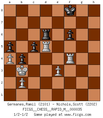 Last move : 1/2-1/2 2010 December 10 0:32:11 [Event "FICGS__CHESS__RAPID_M__000035"] [Site "FICGS"] [Date "2010.11.04"] [Round "1"] [White "Germanes,Ramil"] [Black "Nichols,Scott"] [Result "1/2-1/2"] [WhiteElo "2101"] [BlackElo "2202"] 1.d4 Nf6 2.c4 e6 3.Nf3 d5 4.Nc3 Be7 5.Bf4 dxc4 6.e3 Nd5 7.Bxc4 Nxf4 8.exf4 O-O 9.O-O Qd6 10.g3 c6 11.Qc2 Nd7 12.Rfe1 Nb6 13.Bd3 g6 14.a3 Nd5 15.Ne4 Qc7 16.h4 Nf6 17.Rad1 Bd7 18.Nxf6+ Bxf6 19.h5 Bg7 20.Ne5 a5 21.hxg6 hxg6 22.g4 Rfd8 23.f5 exf5 24.gxf5 gxf5 25.Bxf5 Bxf5 26.Qxf5 c5 27.d5 Bxe5 28.Rxe5 Ra6 29.Kf1 Rg6 30.Rde1 Kf8 31.Qh3 Qd6 32.Qc3 Rh6 33.R1e4 Qa6+ 34.Ke1 Rh1+ 35.Kd2 Qh6+ 36.Qe3 Qxe3+ 37.fxe3 b5 38.a4 Rh2+ 39.Kc3 b4+ 40.Kb3 Rd2 41.Rc4 f6 42.Rf4 Rd6 43.Rh5 R2xd5 44.Rxd5 1/2-1/2 Queen's pawn game Kingside Castling by player Black (move 8) Kingside Castling by player White (move 9) This chess game ended in a draw. Follow this game move after move (download)Live, lose, and learn, by observing your opponent how to win. (Amber Steenbock) Alle offensichtlichen Züge sehen nach dem Spiel in der Analyse verdächtig aus. (Viktor Kortschnoi) Combinaciones deslumbrantes son para la mayoría, mover madera es para los pocos. (Georg Kieninger) Il vaut mieux sacrifier les pièces de l'adversaire. (Xavier Tartacover) It's not the size of the dog in the fight, it's the size of the fight in the dog. (Mark Twain)