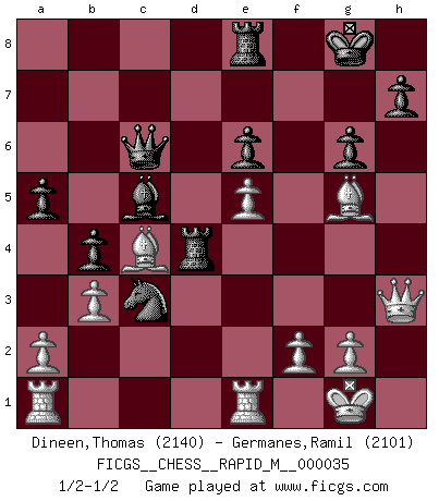 Last move : 1/2-1/2 2010 December 17 2:55:46 [Event "FICGS__CHESS__RAPID_M__000035"] [Site "FICGS"] [Date "2010.11.04"] [Round "1"] [White "Dineen,Thomas"] [Black "Germanes,Ramil"] [Result "1/2-1/2"] [WhiteElo "2140"] [BlackElo "2101"] 1.d4 Nf6 2.c4 e6 3.Nf3 d5 4.Nc3 c6 5.e3 Nbd7 6.Bd3 dxc4 7.Bxc4 b5 8.Bd3 Bb7 9.e4 b4 10.Na4 c5 11.e5 Nd5 12.O-O cxd4 13.Re1 a6 14.Nxd4 g6 15.Qg4 Qa5 16.b3 Nc5 17.Nxc5 Bxc5 18.Nf3 Qb6 19.Qg3 O-O 20.Bg5 a5 21.Nd2 Nc3 22.h4 Ba6 23.Nc4 Bxc4 24.Bxc4 Qc6 25.Qg4 Rfd8 26.h5 Rd4 27.Qh3 Re8 28.hxg6 fxg6 1/2-1/2 Queen's pawn game Kingside Castling by player White (move 12) Kingside Castling by player Black (move 19) This chess game ended in a draw. Follow this game move after move (download)Chess is a fairy tale of 1001 blunders. (Savielly Tartakower) Dein Körper muss in Topform sein. Dein Schach verfällt, wenn dein Körper verfällt. Der Körper kann nicht vom Geist getrennt werden. (Robert James Fischer) Tu no necesitas jugar muy bien, únicamente ayudar a tu oponenet a que juegue muy mal. (Genrikh Chepukaitis) Mais n'est-ce pas déjà le limiter injurieusement que d'appeler les échecs un jeu? N'est-ce pas aussi une science, un art, ou quelque chose qui, comme le cercueil de Mahomet entre ciel et terre, est suspendu entre l'un et l'autre, et qui réunit un nombre incroyable de contraires ? (Stefan Zweig) Memory is a complicated thing, a relative to truth, but not its twin. (Barbara Kingsolver, Animal Dreams)