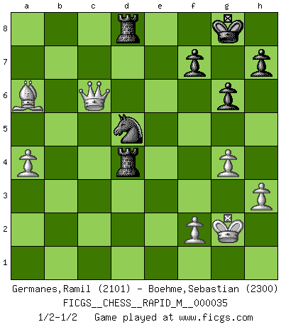 Last move : 1/2-1/2 2011 February 4 13:11:51 [Event "FICGS__CHESS__RAPID_M__000035"] [Site "FICGS"] [Date "2010.11.04"] [Round "1"] [White "Germanes,Ramil"] [Black "Boehme,Sebastian"] [Result "1/2-1/2"] [WhiteElo "2101"] [BlackElo "2300"] 1.d4 d5 2.c4 e6 3.Nc3 Nf6 4.Nf3 c6 5.e3 Nbd7 6.Qc2 Bd6 7.Bd3 dxc4 8.Bxc4 O-O 9.O-O a6 10.Rd1 b5 11.Be2 Qc7 12.e4 e5 13.h3 exd4 14.Nxd4 Re8 15.a3 Be5 16.Bf3 g6 17.Be3 c5 18.Nb3 Bb7 19.a4 b4 20.Nd5 Nxd5 21.exd5 Bh2+ 22.Kh1 Bd6 23.Rac1 Rac8 24.Qe2 c4 25.Nd2 c3 26.bxc3 bxc3 27.Ne4 Be5 28.d6 Qb8 29.Rb1 c2 30.Rxb7 Qxb7 31.Nf6+ Nxf6 32.Bxb7 cxd1Q+ 33.Qxd1 Rcd8 34.g4 Rxd6 35.Qc2 Bd4 36.Bxd4 Rxd4 37.Kg2 Nd5 38.Bxa6 Rd8 39.Qc6 1/2-1/2 QGD Semi-Slav : Stoltz variation Kingside Castling by player Black (move 8) Kingside Castling by player White (move 9) Promotion Queen by player Black (move 32) This chess game ended in a draw. Follow this game move after move (download)I prefer to lose a really good game than to win a bad one. (David Levy) Moralische Siege zählen nicht. (Savielly Grigorievitsch Tartakower) Cuando me preguntan: -¿Cual es el secreto que te hace hacer mejores movidas que tus oponentes?, Yo respondo: Me da gusto que me pregunten eso, porque, como veran, hay una simple razón. Yo pienso mis propias movidas y dejo a mi oponente que el piense las suyas. (Alexander Alekhine) Si je n'étais pas joueur d'échecs, je serais le meilleur dans quelque chose d'autre. (Anatoli Karpov) I find your interest interesting. (Gregory House, House M.D.)