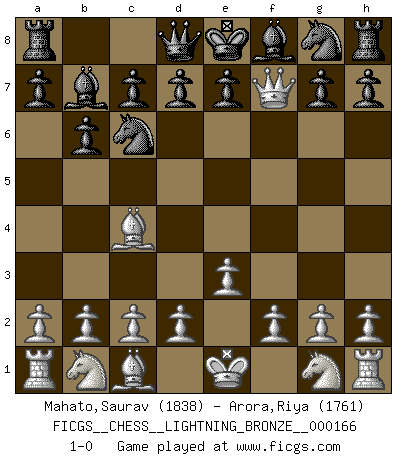 Last move : 1-0 2010 November 6 19:50:48 [Event "FICGS__CHESS__LIGHTNING_BRONZE__000166"] [Site "FICGS"] [Date "2010.11.06"] [Round "1"] [White "Mahato,Saurav"] [Black "Arora,Riya"] [Result "1-0"] [WhiteElo "1838"] [BlackElo "1761"] 1.e3 Nc6 2.Qf3 b6 3.Bc4 Bb7 4.Qxf7+ 1-0 Van't Kruijs Opening Player White won this chess game. Follow this game move after move (download)You know, comrade Pachman, I don't enjoy being a Minister, I would rather play Chess like you. (Che Guevara) Ich organisiere ein großes Turnier, was mich etwa 120000 Dollar kostet. Ich denke, das ist das erste Mal in der Schachgeschichte, daß ein Schachgroßmeister auch als Mäzen auftritt. (Miguel Najdorf) Una compensación adecuada por un sacrificio es tener una combinación sólida que conduce a una posición ganadora; una compensación adecuada por una metida de pata es dejar a tu oponente arrebatar una derrota de las fauces de la victoria. (Bruce A. Moon) Vous m'avez demandé de vous exposer quel est le fondement de la prière. Je ne fais que préparer les pièces du jeu sur la table... Nous sera-t-il permis d'en adopter les règles et si nous les appliquons scrupuleusement nous ne tarderons pas à faire mat le Roi divin ! Il ne pourra échapper à nos mains. (Sainte Thérèse d'Avila, Chemin de perfection) Pushing plastic is for the many, pushing virtual pieces is for the fewer, pushing wood is for the very few. (Normajean Yates)
