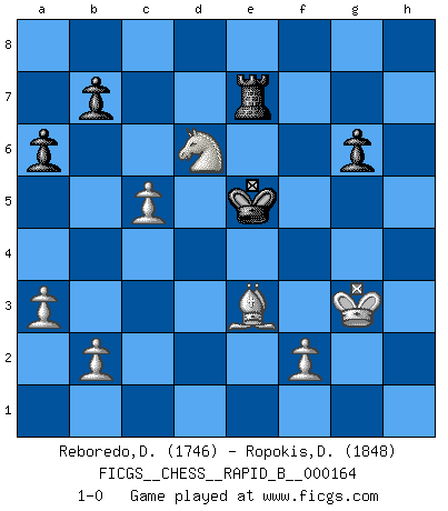 Last move : 1-0 2011 January 8 21:45:8 [Event "FICGS__CHESS__RAPID_B__000164"] [Site "FICGS"] [Date "2010.11.06"] [Round "1"] [White "Reboredo,Daniel"] [Black "Ropokis,Dimitrios"] [Result "1-0"] [WhiteElo "1746"] [BlackElo "1848"] 1.e4 c6 2.d4 d5 3.exd5 cxd5 4.Bd3 Nf6 5.h3 e6 6.Nf3 Nc6 7.O-O Bd6 8.Be3 O-O 9.Nc3 a6 10.a3 Bd7 11.Re1 Rc8 12.Qe2 Re8 13.Qd2 Qc7 14.Bh6 Nh5 15.Qg5 g6 16.Qh4 Be7 17.Bg5 f6 18.Bd2 f5 19.Bg5 Bf8 20.Ne2 e5 21.g4 fxg4 22.hxg4 Bxg4 23.Qxg4 e4 24.Nc3 exd3 25.Nxd5 Qd6 26.Nb6 Rb8 27.Nd7 Rbc8 28.c4 Nb8 29.Nde5 Nc6 30.Nxd3 Nf6 31.Qf4 Qxf4 32.Bxf4 Na5 33.Rxe8 Rxe8 34.Nde5 Bd6 35.Rc1 Nc6 36.Rd1 Kg7 37.Nxg6 Na5 38.Rc1 Nb3 39.Rc3 hxg6 40.Bxd6 Nxd4 41.Nxd4 Ne4 42.Bb4 Nxc3 43.Bxc3 Kf6 44.Kg2 Ke5 45.Nb5 Kf4 46.Nd6 Re7 47.c5 Rd7 48.Bd4 Re7 49.Be3+ Ke5 50.Kg3 1-0 Caro-Kann : Exchange variation Kingside Castling by player White (move 7) Kingside Castling by player Black (move 8) Player White won this chess game. Follow this game move after move (download)Botvinnik tried to take the mystery out of Chess, always relating it to situations in ordinary life. He used to call Chess a typical inexact problem similar to those which people are always having to solve in everyday life. (Garry Kasparov) Ich könnte leicht behaupten: Ja,ja, Leonid Breschnew wollte nicht, daß ich Weltmeister werde. In der Tat war die Sache komplizierter. (Viktor Kortschnoi) Bobby solo arroja las piezas y solas caen en las casillas correctas. (Miguel Najdorf ) Assurément je connaissais par expérience le mystérieux attrait de ce jeu royal, le seul entre tous les jeux inventés par les hommes qui échappe souverainement à la tyrannie du hasard, le seul où l'on ne doive sa victoire qu'à son intelligence ou plutôt à une certaine forme d'intelligence. Mais n'est-ce pas déjà le limiter injurieusement que d'appeler les échecs un jeu ? N'est-ce pas une science, un art ou quelque chose qui, comme le cercueil de Mahomet entre ciel et terre, est suspendu entre l'un et l'autre, et qui réunit un nombre incroyable de contraires ? [...] C'est une pensée qui ne mène à rien, une mathématique qui n'établit rien, un art qui ne laisse pas d'uvre, une architecture sans matière; et il l'a prouvé néanmoins qu'il était plus durable, à sa manière, que les livres ou que tout autre monument, ce jeu unique qui appartient à tous les peuples et à tous les temps, et dont personne ne sait quel dieu en fit don à la terre pour tuer l'ennui, pour aiguiser l'esprit et stimuler l'âme. Où commence-t-il, où finit-il ? (Stefan Zweig) Knowledge rests not upon truth alone, but upon error also. (Carl G. Jung)