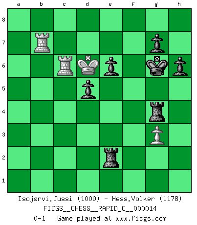 Last move : 0-1 2007 February 20 23:13:43 [Event "FICGS__CHESS__RAPID_C__000014"] [Site "FICGS"] [Date "2006.11.28"] [Round "1"] [White "Isojarvi,Jussi"] [Black "Hess,Volker"] [Result "0-1"] [WhiteElo "1000"] [BlackElo "1178"] 1.d4 f5 2.Qd3 e6 3.Nc3 Nf6 4.d5 Bb4 5.Bd2 Bxc3 6.Qxc3 O-O 7.Bg5 Nxd5 8.Bxd8 Nxc3 9.Bxc7 Nd5 10.Bd6 Re8 11.O-O-O b6 12.e3 Ba6 13.Nf3 Bxf1 14.Rhxf1 Nc6 15.Rfe1 Ncb4 16.e4 fxe4 17.Rxe4 Nxa2+ 18.Kb1 Nab4 19.Bxb4 Nxb4 20.Rxb4 Red8 21.Ra4 b5 22.Ra5 a6 23.Ne5 Kf8 24.c4 bxc4 25.Nxc4 d5 26.Nb6 Ra7 27.f4 Rb8 28.Na4 Rb5 29.b4 Rxb4+ 30.Kc2 Rc7+ 31.Kd3 Rxf4 32.Rxa6 Kf7 33.Rb1 R7c4 34.g3 Rfd4+ 35.Ke3 Rxa4 36.Rc6 Re4+ 37.Kf3 Ra3+ 38.Kg2 Ra2+ 39.Kh3 R4e2 40.Kg4 Rxh2 41.Kg5 h6+ 42.Kf4 Ra4+ 43.Ke5 Re2+ 44.Kd6 Rg4 45.Rb7+ Kg6 0-1 This chess game has been lost on time (started : 2006.11.28 9:38:32) Dutch, Manhattan (Alapin, Ulvestad) variation Kingside Castling by player Black (move 6) Queenside Castling by player White (move 11) Player Black won this chess game. Follow this game move after move (download)A chess genius has died; a loss for humanity. (Viktor Kortchnoi, about Bobby Fischer's death) Ich war zu klein für die Schach-Schülermannschaft! (Woody Allen) Cuando veas una buena jugada, trata de encontrar otra mejor. (Emanuel Lasker) Pour se monter efficace, un Cavalier a besoin d'avant-postes ! Les Cavaliers font les meilleurs bloqueurs de pions passés. The next best thing to gambling and winning is gambling and loosing. (Nick Dandalos)