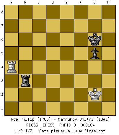 Last move : 1/2-1/2 2010 December 1 11:26:29 [Event "FICGS__CHESS__RAPID_B__000164"] [Site "FICGS"] [Date "2010.11.06"] [Round "1"] [White "Roe,Philip"] [Black "Mamrukov,Dmitri"] [Result "1/2-1/2"] [WhiteElo "1786"] [BlackElo "1841"] 1.e4 c5 2.Nf3 Nc6 3.d4 cxd4 4.Nxd4 g6 5.c4 Nf6 6.Nc3 d6 7.Be2 Nxd4 8.Qxd4 Bg7 9.O-O O-O 10.Qe3 Be6 11.Bd2 Qb6 12.b3 Qxe3 13.Bxe3 Ng4 14.Bd2 Be5 15.g3 Nf6 16.f3 Bh3 17.Rfd1 Bd4+ 18.Kh1 a6 19.Rac1 Kg7 20.Bg5 Bc5 21.Bxf6+ exf6 22.g4 Rh8 23.Rd3 h5 24.b4 Ba7 25.Rxd6 hxg4 26.fxg4 Bb8 27.Rb6 Bxg4 28.Bxg4 Rxh2+ 29.Kg1 Rh4 30.Bd7 Ba7 31.c5 Bxb6 32.cxb6 Rd8 33.Ba4 f5 34.exf5 Rxb4 35.fxg6 fxg6 36.Re1 Rd3 37.Re7+ Kf6 38.Rc7 Rxc3 39.Rxc3 Rxa4 40.Rc7 Rxa2 41.Rxb7 Rb2 42.Rb8 a5 43.b7 Kg5 44.Ra8 Rxb7 45.Rxa5+ Kh4 46.Ra4+ Kh5 47.Kg2 Rb3 48.Rc4 g5 49.Ra4 Kg6 1/2-1/2 Sicilian : Accelerated Fianchetto, Maroczy bind Kingside Castling by player White (move 9) Kingside Castling by player Black (move 9) 10 pieces endgame at move 39 : White KRBPP , Black KRPPP WHITE : King + 1 Rook 1 Bishop 2 Pawns BLACK : King + 1 Rook 3 Pawns 9 pieces endgame at move 39 : White KRPP , Black KRPPP WHITE : King + 1 Rook 2 Pawns BLACK : King + 1 Rook 3 Pawns 8 pieces endgame at move 40 : White KRP , Black KRPPP WHITE : King + 1 Rook 1 Pawn BLACK : King + 1 Rook 3 Pawns 7 pieces endgame at move 41 : White KRP , Black KRPP WHITE : King + 1 Rook 1 Pawn BLACK : King + 1 Rook 2 Pawns 6 pieces endgame at move 44 : White KR , Black KRPP WHITE : King + 1 Rook BLACK : King + 1 Rook 2 Pawns 5 pieces endgame at move 45 : White KR , Black KRP WHITE : King + 1 Rook BLACK : King + 1 Rook 1 Pawn This chess game ended in a draw. Follow this game move after move (download)Life is a kind of Chess, with struggle, competition, good and ill events. (Benjamin Franklin) Im Hotelzimmer gab es nur zwei Schaben. (Über die Turnierbedingungen) (Peter Swidler) Cuando la partida de Ajedrez termina, el Peón y el Rey regresan a la misma caja. (Irish saying) Les Echecs, c'est l'art de la guerre sans les charniers, c'est la résurrection des morts tombés au champ d'honneur, l'espoir perpétuel, la suprématie de l'intelligence sur la force, la culture de l'esprit. (F. Szpiner) Life is like internet, nothing interesting, but noone want to leave it. (Ilmars Cirulis)