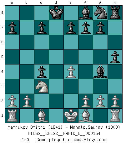 Last move : 1-0 2010 December 17 10:37:0 [Event "FICGS__CHESS__RAPID_B__000164"] [Site "FICGS"] [Date "2010.11.06"] [Round "1"] [White "Mamrukov,Dmitri"] [Black "Mahato,Saurav"] [Result "1-0"] [WhiteElo "1841"] [BlackElo "1800"] 1.d4 d5 2.c4 dxc4 3.Nf3 Bg4 4.Ne5 h5 5.Nc3 Nc6 6.Nxc6 bxc6 7.Qa4 Qxd4 8.Qxc6+ Qd7 9.Qxa8+ Qd8 10.Qxd8+ Kxd8 11.e4 1-0 This chess game has been lost on time (started : 2010.11.06 21:14:16) QGA : 3.Nf3 Player White won this chess game. Follow this game move after move (download)Fischer was a master of clarity and a king of artful positioning. His opponents would see where he was going but were powerless to stop him. (Bruce Pandolfini) Wir irren allesamt, nur jeder irrt anders. (Georg Christoph Lichtenberg) Al jugar al Ajedrez entonces, podemos aprender: Primero: Previsión... Segundo: Prudencia... Tercero: Cautela... Y al final, aprendemos del Ajedrez el hábito de no ser desanimados por apariencias malas presentes en el estado de nuestros asuntos, el hábito de la esperanza por una oportunidad favorable y la perseveración de los secretos de los recursos. (Benjamin Franklin) Vous savez, camarade Pachman, je n'éprouve pas de plaisir à être ministre, je jouerais plutôt aux échecs comme vous, ou alors ferais une révolution au Venezuela. (Che Guevara à Ludek Pachman, 'Checkmate in Prague', 1975) Creativity is allowing yourself to make mistakes. Art is knowing which ones to keep. (Scott Adams)