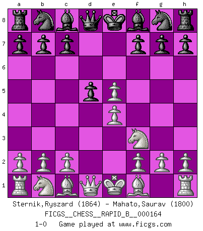 Last move : 1-0 2010 December 11 22:27:8 [Event "FICGS__CHESS__RAPID_B__000164"] [Site "FICGS"] [Date "2010.11.06"] [Round "1"] [White "Sternik,Ryszard"] [Black "Mahato,Saurav"] [Result "1-0"] [WhiteElo "1864"] [BlackElo "1800"] 1.e4 e5 2.Nf3 d6 3.d4 d5 4.dxe5 1-0 This chess game has been lost on time (started : 2010.11.06 21:14:16) Philidor's defense Player White won this chess game. Follow this game move after move (download)Chess is ruthless: you've got to be prepared to kill people. (Nigel Short) Wer der Ansicht ist, daß alle Schachspieler verrückt sind, wird durch Studium des Lebens von Emil Josef Diemer nicht auf andere Gedanken kommen. (Hans Ree) Si yo gano un torneo, yo lo gano por mí mismo. Yo hago las jugadas. Nadie me ayuda. (Bobby Fischer) Que feriez-vous si vous étiez en train de jouer aux échecs et que la fin du monde arrive ? Je continuerais à jouer. (Saint Borromée) 98% of all statistics are made up. (Author unknown)