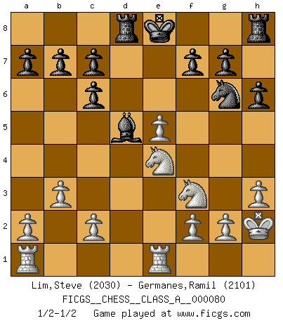 Last move : 1/2-1/2 2010 December 8 12:40:52 [Event "FICGS__CHESS__CLASS_A__000080"] [Site "FICGS"] [Date "2010.11.06"] [Round "1"] [White "Lim,Steve"] [Black "Germanes,Ramil"] [Result "1/2-1/2"] [WhiteElo "2030"] [BlackElo "2101"] 1.e4 e5 2.Nf3 Nc6 3.Bb5 Nf6 4.O-O Nxe4 5.d4 Nd6 6.Bxc6 dxc6 7.dxe5 Nf5 8.Qxd8+ Kxd8 9.Nc3 Be7 10.Rd1+ Ke8 11.Bg5 Bxg5 12.Nxg5 h6 13.Nf3 Be6 14.b3 Rd8 15.h3 Ne7 16.Ne4 Bd5 17.Re1 Ng6 18.Kh2 1/2-1/2 Ruy Lopez : Berlin defense, Open variation Kingside Castling by player White (move 4) This chess game ended in a draw. Follow this game move after move (download)When you don't know what to play, wait for an idea to come into your opponent's mind. You may be sure that idea will be wrong. (Siegbert Tarrasch) Ohne Fehler kann es keine Brillanz geben. (Emanuel Lasker) Aunque la mayoría de la gente disfruta observar las partidas de los grandes Maestros de ataque, algunos de los jugadores mas notables en la historia han sido los jugadores silenciosos posicionales. Lentamente ellos te aplastan despojandote de tu espacio, congestionando tus piezas y dejandote virtualmente sin nada que hacer. (Yasser Seirawan) Assurément je connaissais par expérience le mystérieux attrait de ce jeu royal, le seul entre tous les jeux inventés par les hommes qui échappe souverainement à la tyrannie du hasard, le seul où l'on ne doive sa victoire qu'à son intelligence ou plutôt à une certaine forme d'intelligence. Mais n'est-ce pas déjà le limiter injurieusement que d'appeler les échecs un jeu ? N'est-ce pas une science, un art ou quelque chose qui, comme le cercueil de Mahomet entre ciel et terre, est suspendu entre l'un et l'autre, et qui réunit un nombre incroyable de contraires ? [...] C'est une pensée qui ne mène à rien, une mathématique qui n'établit rien, un art qui ne laisse pas d'uvre, une architecture sans matière; et il l'a prouvé néanmoins qu'il était plus durable, à sa manière, que les livres ou que tout autre monument, ce jeu unique qui appartient à tous les peuples et à tous les temps, et dont personne ne sait quel dieu en fit don à la terre pour tuer l'ennui, pour aiguiser l'esprit et stimuler l'âme. Où commence-t-il, où finit-il ? (Stefan Zweig) A journey of a thousand sites begins with a single click. (Author unknown)