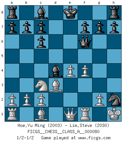 Last move : 1/2-1/2 2010 November 12 1:37:0 [Event "FICGS__CHESS__CLASS_A__000080"] [Site "FICGS"] [Date "2010.11.06"] [Round "1"] [White "Hoe,Yu Ming"] [Black "Lim,Steve"] [Result "1/2-1/2"] [WhiteElo "2003"] [BlackElo "2030"] 1.e4 e5 2.Nf3 Nc6 3.d4 exd4 4.Nxd4 Bc5 5.Nxc6 Qf6 6.Qd2 dxc6 7.Nc3 Bd4 8.Bd3 Ne7 9.O-O Ng6 10.Kh1 Ne5 11.f4 Ng4 12.Qe1 Nxh2 1/2-1/2 Comment by player 2 : Steve Lim : Always intend to win. But I fear this line with white doesn't lead to anything for either side. By the way, I'm new.. how do you chat on this thing? The UI is 'unusual'. =) Scotch game Kingside Castling by player White (move 9) This chess game ended in a draw. Follow this game move after move (download)Alekhine is a poet who creates a work of art out of something that would hardly inspire another man to send home a picture post card. (Max Euwe) Wenn ich mich einlogge, glauben die Leute gewöhnlich nicht, dass ich es selbst bin und sie fangen an, mir dumme Fragen zu stellen. Und wenn sie es glauben, stellen sie wieder andere dumme Fragen. (Judith Polgar) Fischer sacrificó virtualmente todo lo que la mayoría de nosotros los 'debiles' (término que él usa) valoramos, respetamos y apreciamos por el amor de un astuto, a menudo hermoso tablero de juego, por el privilegio ambivalente de ser su mas grande maestro. (Paul Kollar) Seul un grand joueur sait à quel point il joue faiblement. (Xavier Tartacover) No enterprise is more likely to succeed than one concealed from the enemy until it is ripe for execution. (Niccolo Machiavelli)