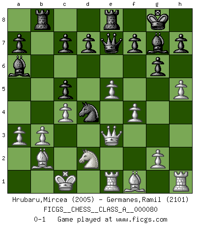 Last move : 0-1 2011 February 20 10:48:56 [Event "FICGS__CHESS__CLASS_A__000080"] [Site "FICGS"] [Date "2010.11.06"] [Round "1"] [White "Hrubaru,Mircea"] [Black "Germanes,Ramil"] [Result "0-1"] [WhiteElo "2005"] [BlackElo "2101"] 1.e4 e5 2.Nf3 Nc6 3.d4 exd4 4.Nxd4 Nf6 5.Nxc6 bxc6 6.e5 Qe7 7.Qe2 Nd5 8.c4 Ba6 9.b3 g6 10.Ba3 Nb4 11.Bb2 Bg7 12.a3 Nd5 13.Nd2 O-O 14.O-O-O Rab8 15.h4 Rfe8 16.Re1 Nf4 17.Qe3 Ne6 18.h5 c5 19.f4 Nd4 0-1 This chess game has been lost on time (started : 2010.11.06 23:2:4) Scotch : Mieses variation Kingside Castling by player Black (move 13) Queenside Castling by player White (move 14) Player Black won this chess game. Follow this game move after move (download)You may learn much more from a game you lose than from a game you win. You will have to lose hundreds of games before becoming a good player. (Jose Raul Capablanca) Offener Brief an US-Präsident Bush anlässlich der Verhaftung Bobby Fishers: Verhaften Sie mich. Stecken Sie mich in dieselbe Zelle wie Bobby Fisher und geben Sie uns ein Schachspiel mit. (Boris Vassilievich Spassky) El jugador de combinación piensa hacia adelante; comienza de la posición dada y trabaja las movidas contundentes en su mente. (Emanuel Lasker) Vous savez, camarade Pachman, je n'éprouve pas de plaisir à être ministre, je jouerais plutôt aux échecs comme vous, ou alors ferais une révolution au Venezuela. (Che Guevara à Ludek Pachman, 'Checkmate in Prague', 1975) We're missing something. (Gregory House, House M.D.)