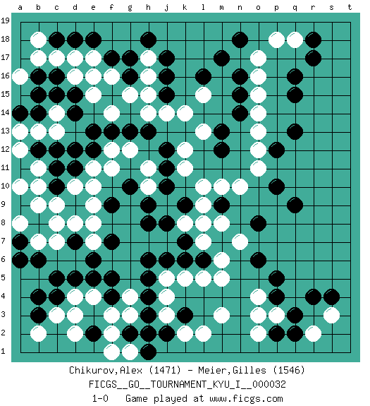 Last move : 1-0 2010 November 10 15:57:53 [Event "FICGS__GO__TOURNAMENT_KYU_I__000032"] [Site "FICGS"] [Date "2010.11.07"] [Round "1"] [Black "Chikurov,Alex"] [White "Meier,Gilles"] [Result "1-0"] [Rating 1 "1471"] [Rating 2 "1546"] 1.q16 d4 2.r4 d16 3.p4 o17 4.m17 o15 5.q15 o13 6.q13 q18 7.r17 m3 8.h3 f3 9.k3 m5 10.j6 o2 11.p2 o3 12.f17 c14 13.j16 p3 14.q3 d10 15.c4 c3 16.d5 d3 17.c5 c7 18.f4 e4 19.e5 g4 20.f5 g3 21.d9 c9 22.c10 c8 23.d11 e10 24.c12 e8 25.d7 e7 26.e6 d8 27.h5 e11 28.e12 f12 29.e13 h11 30.f13 g12 31.d18 c17 32.c18 b18 33.b16 b17 34.b14 b13 35.c15 c13 36.d15 f16 37.g16 e17 38.e18 g15 39.f15 e16 40.g17 e15 41.d14 f14 42.g13 h15 43.j15 h14 44.h13 j14 45.j12 k14 46.n16 o16 47.n14 o14 48.m13 k12 49.j11 l13 50.m12 k11 51.j10 l10 52.q9 n10 53.m9 m10 54.o8 o11 55.p12 o12 56.f9 e9 57.g10 h10 58.h9 j9 59.h8 b10 60.c11 b11 61.b12 a12 62.d12 a13 63.a14 b9 64.a11 a10 65.o6 o4 66.p5 l15 67.l16 h16 68.j17 h17 69.h18 f11 70.k9 l9 71.m7 l7 72.l6 l2 73.b3 b2 74.b4 m8 75.k7 k8 76.j8 l8 77.p10 k2 78.j2 m6 79.b6 b7 80.f7 k5 81.k6 j4 82.h4 l5 83.n15 j5 84.h6 j3 85.g2 f2 86.e2 g1 87.h2 d2 88.r18 p18 89.n18 n7 90.c16 a16 91.b15 d17 92.h1 f1 93.a7 a8 94.a6 r2 95.q2 s3 96.s4 1-0 Here are the names of the openings (joseki) played in the four corners : Corner q16 : q16 o17 Hoshi (Hwajeom, Seongjeom, Xingwei`) 4-4 Point. The star or hoshi (4-4) point, emphasizing influence at the potential expense of territory. Ikken Kakari (Hankan Keolch'im, Yi Gua`jiao~, 1-Space Low Approach). White 2 is the standard approach move to the 4-4. Corner d4 : d4 h3 Hoshi (Hwajeom, Seongjeom, Xingwei`) 4-4 Point. The star or hoshi (4-4) point, emphasizing influence at the potential expense of territory. Corner d16 : d16 f17 Hoshi (Hwajeom, Seongjeom, Xingwei`) 4-4 Point. The star or hoshi (4-4) point, emphasizing influence at the potential expense of territory. Ikken Kakari (Hankan Keolch'im, Yi Gua`jiao~, 1-Space Low Approach). Black 2 is the standard approach move to the 4-4. Player Black won this Go (weiqi, baduk) game. Follow this game move after move (download)Atari, atari is vulgar play. (Anonymous) In fact if nothing is done against this teddy bear, hereby I announce that I would quit chess, rapid chess, blitz chess, postal chess, email chess, server chess and correspondence chess I will then switch to a table game where teddy bears aren't going to be seen for a while, like Poker, or Roulette, all 18+ games. (Elmer Valderrama)