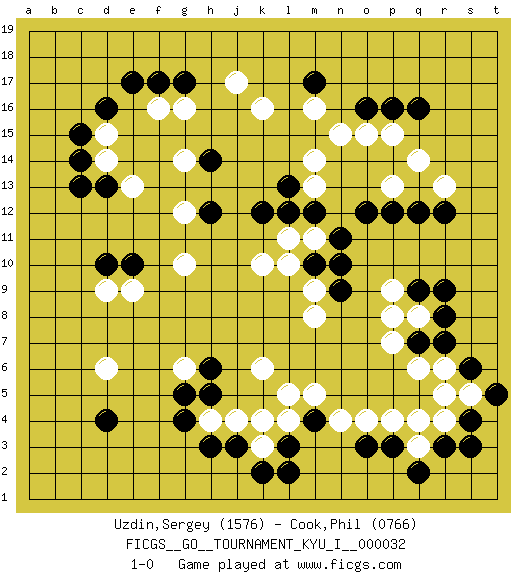 Last move : 1-0 2011 March 21 0:35:23 [Event "FICGS__GO__TOURNAMENT_KYU_I__000032"] [Site "FICGS"] [Date "2010.11.07"] [Round "1"] [Black "Uzdin,Sergey"] [White "Cook,Phil"] [Result "1-0"] [Rating 1 "1576"] [Rating 2 "0766"] 1.q16 q4 2.d4 q14 3.o16 k16 4.m17 j17 5.d16 d14 6.g17 g16 7.f17 f16 8.e17 d6 9.g4 h4 10.h3 j4 11.g5 n15 12.l3 l4 13.m4 l5 14.o3 o4 15.p3 p4 16.r3 r4 17.d10 d9 18.e10 g10 19.d13 e13 20.c13 e9 21.c14 d15 22.c15 g6 23.r12 r13 24.q12 p15 25.p16 m16 26.r9 q8 27.r8 q6 28.j3 k3 29.k2 k4 30.l2 m5 31.o12 p13 32.p12 o15 33.m12 m13 34.l13 m14 35.k12 k10 36.h5 k6 37.q9 p9 38.h12 g12 39.s4 r6 40.q7 p8 41.r7 p7 42.s6 s5 43.t5 r5 44.s3 q3 45.q2 n4 46.m10 m9 47.n9 m8 48.n10 l11 49.l12 m11 50.n11 l10 51.h14 g14 52.h6 1-0 This go game has been lost on time (started : 2010.11.07 7:45:39) Here are the names of the openings (joseki) played in the four corners : Corner q16 : q16 q14 Hoshi (Hwajeom, Seongjeom, Xingwei`) 4-4 Point. The star or hoshi (4-4) point, emphasizing influence at the potential expense of territory. Ikken Takagakari (Hankan Nop'dakeolch'im, Yi Gaojia, 1-Space High Approach). Black typically responds at 6-4 or 3-10. Black 4-10 is played when Black finds play on the right side advantageous. Black 4-8 or 3-8 may be played when Black has support at top. Corner d16 : j17 d16 This joseki is unknown. A weak or weird move has probably been played in this corner. Corner d4 : d4 d6 Hoshi (Hwajeom, Seongjeom, Xingwei`) 4-4 Point. The star or hoshi (4-4) point, emphasizing influence at the potential expense of territory. Ikken Takagakari (Hankan Nop'dakeolch'im, Yi Gaojia, 1-Space High Approach). Black typically responds at 6-4 or 3-10. Black 4-10 is played when Black finds play on the right side advantageous. Black 4-8 or 3-8 may be played when Black has support at top. Corner q4 : q4 l3 Hoshi (Hwajeom, Seongjeom, Xingwei`) 4-4 Point. The star or hoshi (4-4) point, emphasizing influence at the potential expense of territory. Player Black won this Go (weiqi, baduk) game. Follow this game move after move (download)... {it is} something unearthly... if there are sentient beings on other planets, then they play go. (Emanuel Lasker, chess world champion) This is where the fun begins. (Anakin Skywalker in Star Wars ep.3)