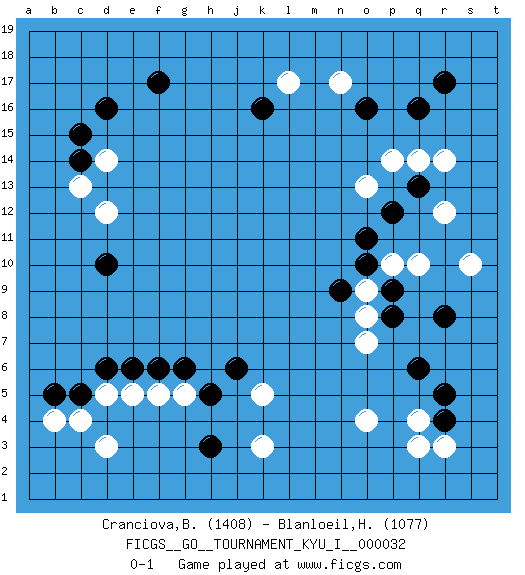 Last move : 0-1 2011 February 25 11:7:28 [Event "FICGS__GO__TOURNAMENT_KYU_I__000032 "] [Site "FICGS"] [Date "2010.11.07"] [Round "1"] [Black "Cranciova,Bogdan "] [White "Blanloeil,Hugues "] [Result "0-1"] [Rating 1 "1408"] [Rating 2 "1077"] 1.q16 d3 2.d16 q4 3.c5 d5 4.d6 e5 5.h3 k3 6.h5 k5 7.e6 f5 8.f6 g5 9.g6 c4 10.b5 b4 11.d10 d14 12.c14 c13 13.c15 d12 14.f17 q10 15.k16 r14 16.q6 o4 17.r4 r3 18.r5 q3 19.r8 s10 20.q13 q14 21.r17 n17 22.o16 p14 23.p12 o13 24.o11 o9 25.p9 p10 26.o10 r12 27.n9 o8 28.p8 o7 29.j6 l17 0-1 This go game has been lost on time (started : 2010.11.07 7:45:39) Here are the names of the openings (joseki) played in the four corners : Corner d4 : d3 c5Komoku (Somok, Xiao~mu`) 3-4 Point. The komoku (3-4) point is the traditional corner enclosure move..Ikken Kakari (Hankan Keolch'im, Yi Gua`jiao~, 1-Space Low Pincer). The small knight move is the basic approach move to the 3-4 point stone. It has been continually used for over four centuries. There are limitless variations, with new moves constantly being discovered. Black 2 opens the door to a treaure store of joseki. Corner d16 : d16 d14Hoshi (Hwajeom, Seongjeom, Xingwei`) 4-4 Point. The star or hoshi (4-4) point, emphasizing influence at the potential expense of territory.Ikken Takagakari (Hankan Nop'dakeolch'im, Yi Gaojia, 1-Space High Approach). Black typically responds at 6-4 or 3-10. Black 4-10 is played when Black finds play on the right side advantageous. Black 4-8 or 3-8 may be played when Black has support at top. Corner q16 : q16 r14Hoshi (Hwajeom, Seongjeom, Xingwei`) 4-4 Point. The star or hoshi (4-4) point, emphasizing influence at the potential expense of territory.Ikken Kakari (Hankan Keolch'im, Yi Gua`jiao~, 1-Space Low Approach). White 2 is the standard approach move to the 4-4. Corner q4 : q4 q6Hoshi (Hwajeom, Seongjeom, Xingwei`) 4-4 Point. The star or hoshi (4-4) point, emphasizing influence at the potential expense of territory.Ikken Takagakari (Hankan Nop'dakeolch'im, Yi Gaojia, 1-Space High Approach). White typically responds at 6-4 or 3-10. White 4-10 is played when White finds play on the right side advantageous. White 4-8 or 3-8 may be played when White has support at top. Player White won this Go (weiqi, baduk) game.Follow this game move after move (download ) Josekis are not fixed, definitive things. They indicate the moments when everything can change. (Pierre Audouard) It is a good thing for an uneducated man to read books of quotations. (Winston Churchill)
